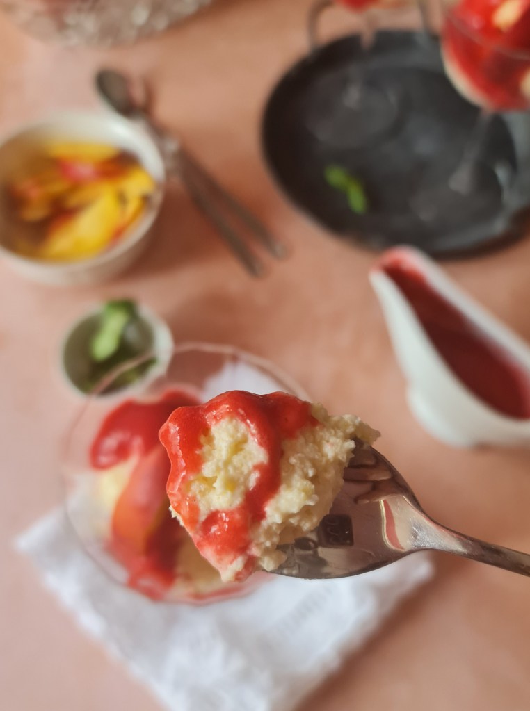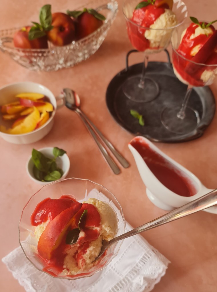 Миналата година правих десерт вдъхновен от оригиналната прасковена мелба и в онзи пост разказах историята й. Сега ще припомня, че оригиналът съдържа само 3 съставки – ваниловсладолед, праскови и малинов сос. В тогавашната рецепта замених сладоледа със смес от кисело мляко и извара.
