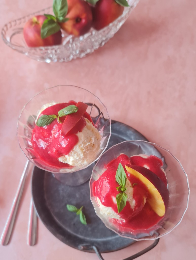 Тази година още през юни времето стана много топло. Дойде времето на охладените десерти и не дочаках сезона на прасковите – направих тази нова рецепта с нектарини. И този път избягах от сладоледения оригинал, но сега беше в полза на мус от бита сметана с плодово пюре.