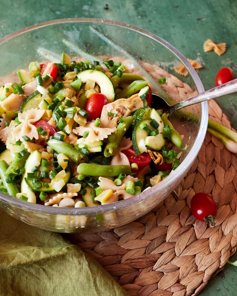 В голяма купа смесете тиквичката, бланширания боб, пастата, артишока и чери доматите. Отделно направете соса, като смесите всички съставки и разбъркате до хомогенизиране. Добавете към зеленчуците и разбъркайте. Гарнирайте с пресния лук и кората на солените лимони.