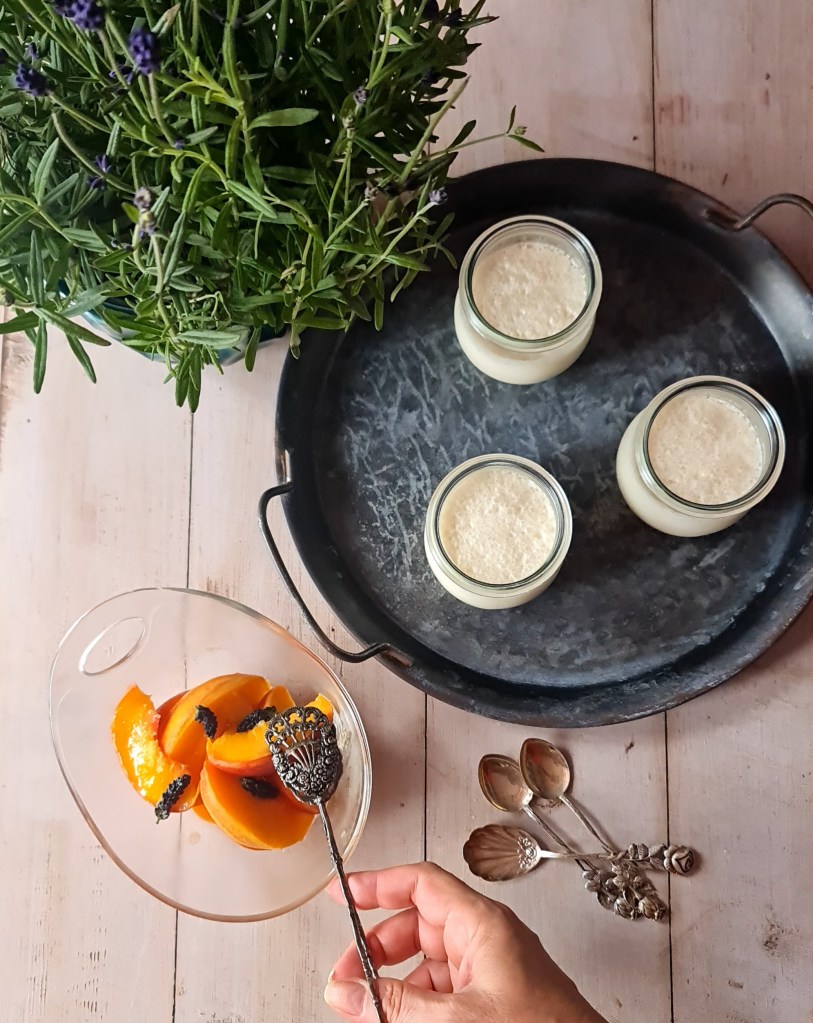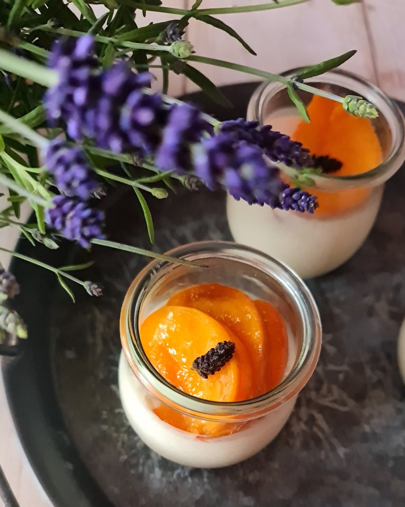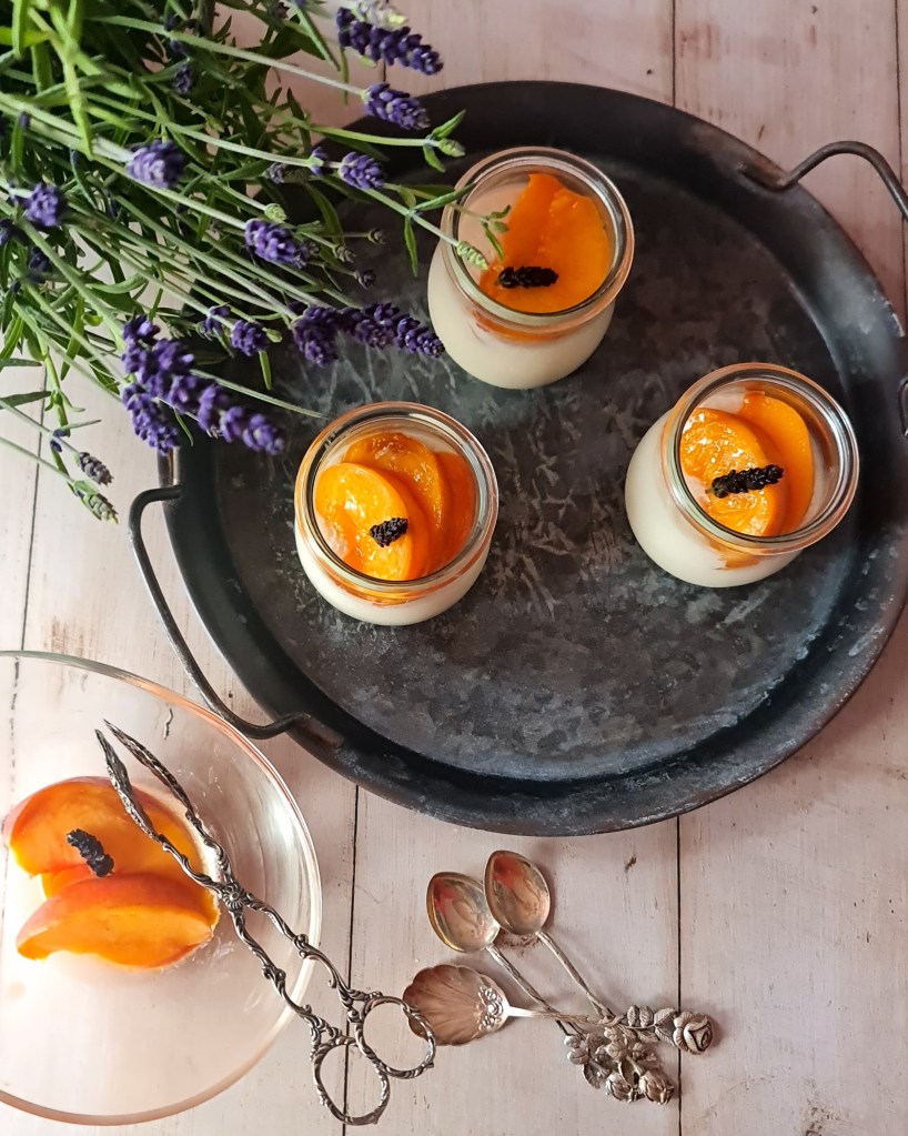 Загрейте маслото в тиган и добавете прасковите и стръкчетата лавандула. Гответе около минута, като обърнете веднъж по средата на времето. Изчакайте да изстинат добре и добавете към муса преди сервиране.