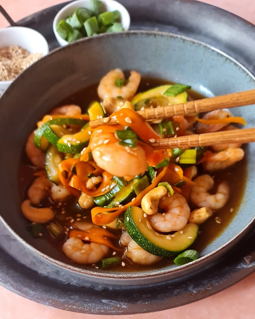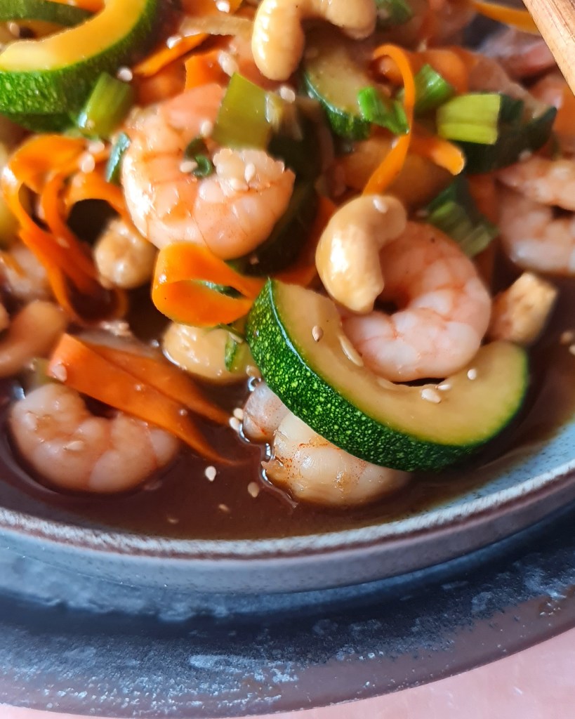 Освен тиквичките, сложих моркови, пресен лук и кашу. Приготвих и лесен сос, подобен на съчуанския, който съм споделяла и преди. Много вкусно, с малко над 40 г протеин в порция.