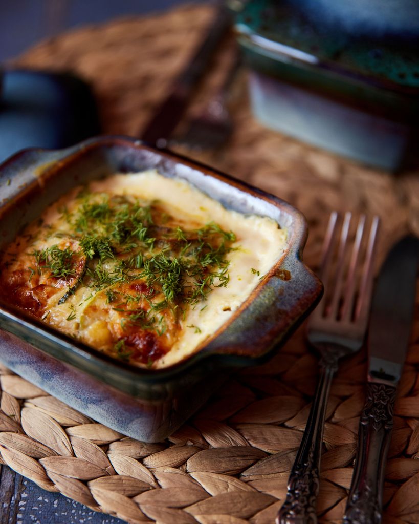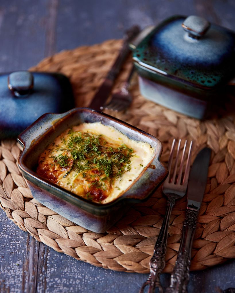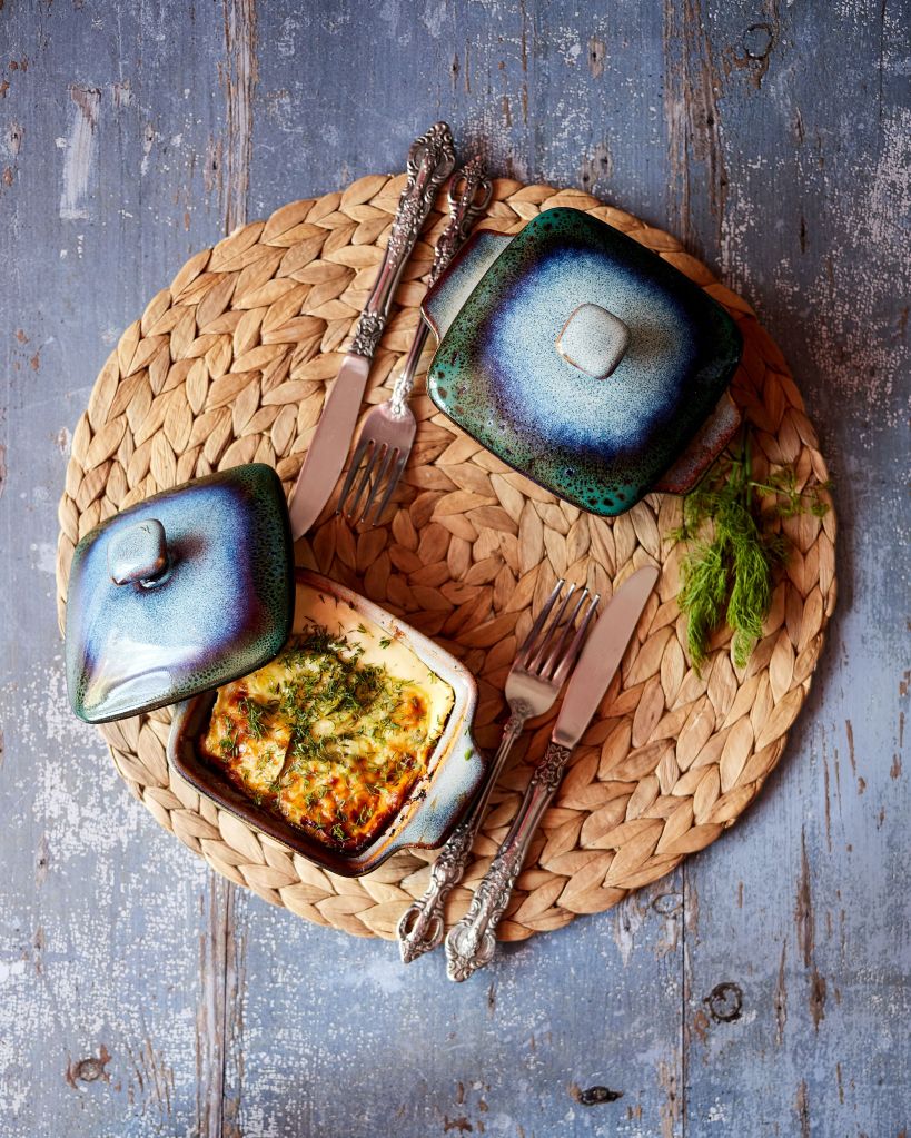 През това време загрейте фурната на 200 градуса и пригответе два малки съда за печене с размер около 10 х 10 см с височина 5 – 6 см или малка тавичка с размер около 10 х 20 см, леко намазани със зехтин.