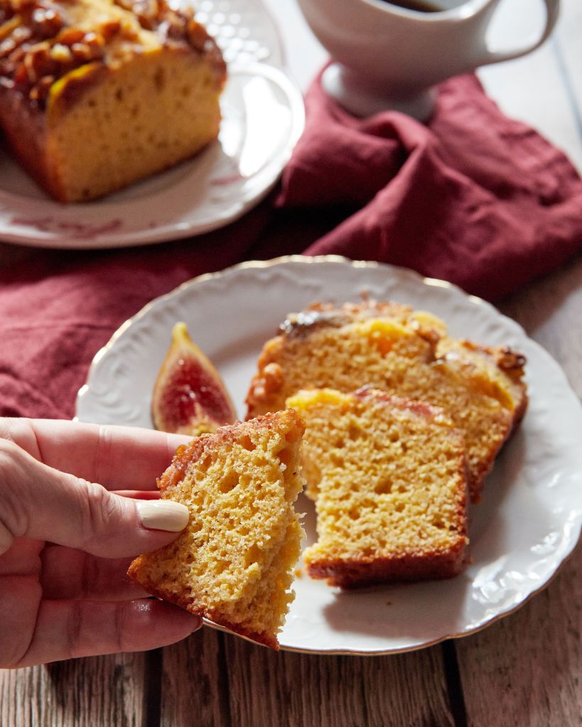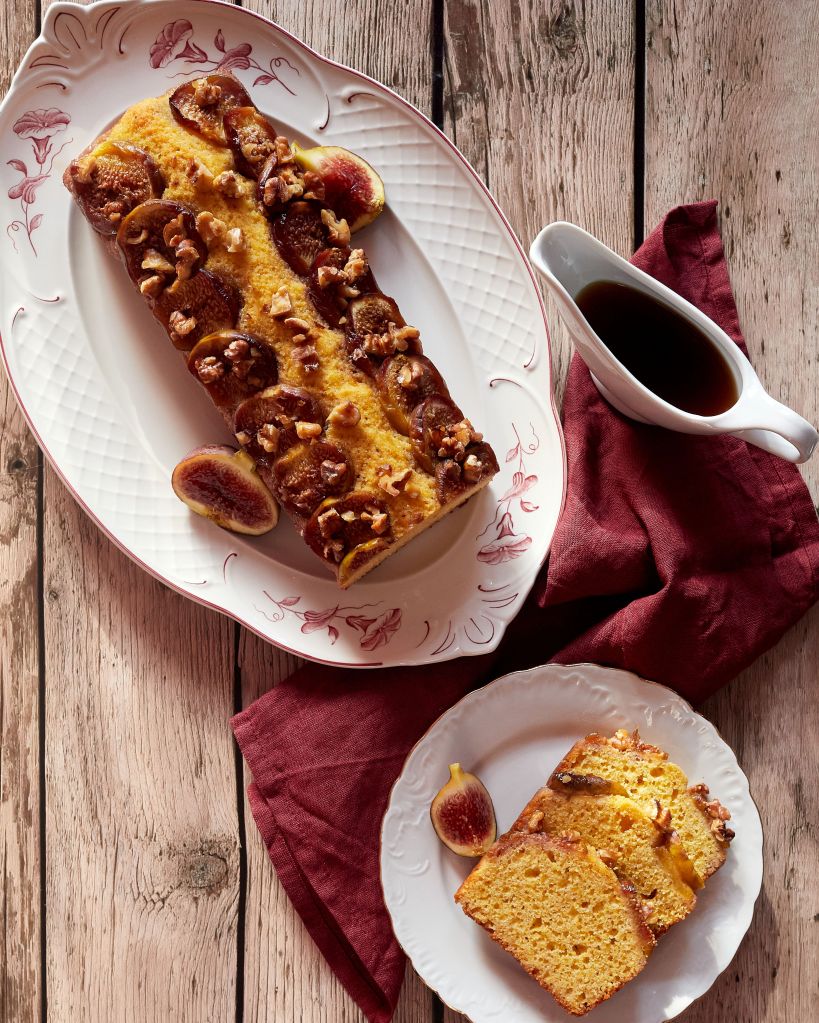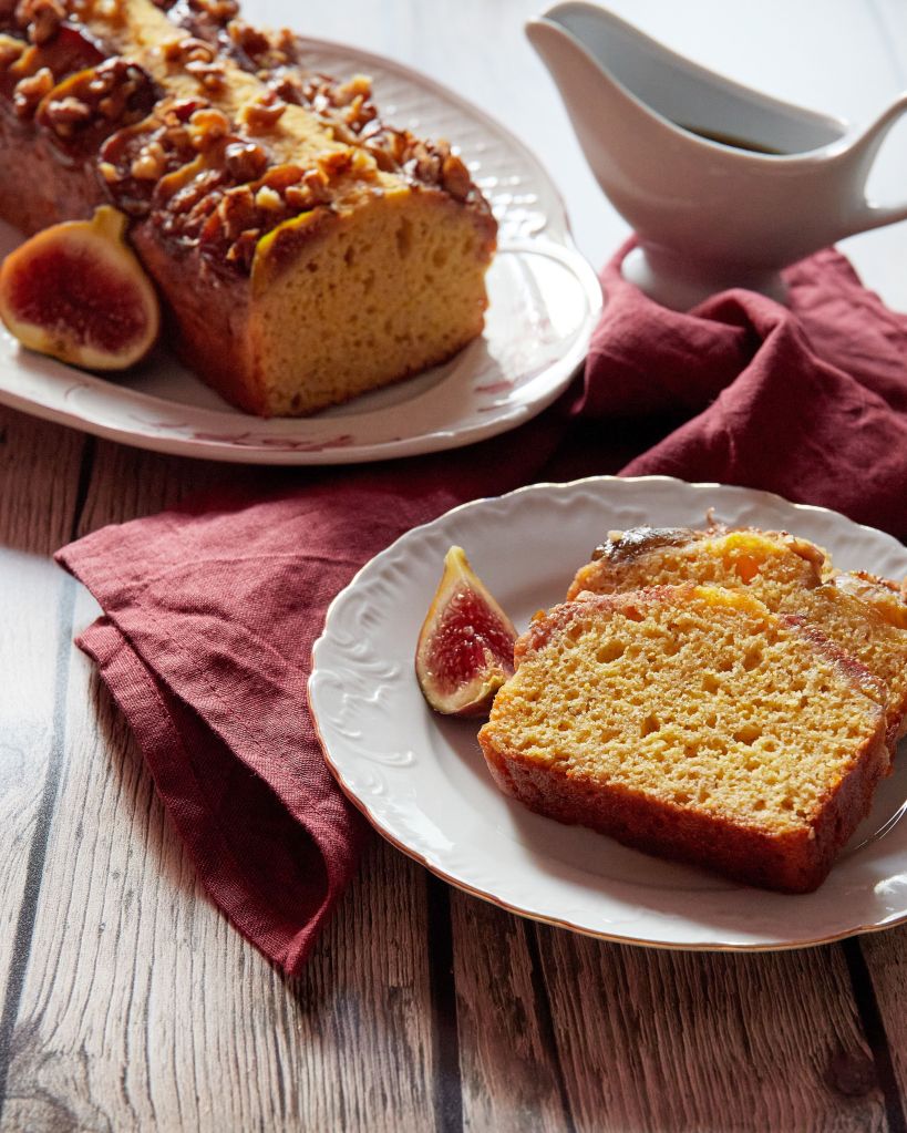 Тази седмица взехме първите смокини. Сигурно не са български, макар да чувам, че в градовете на юг има вече узрели, но не устоях на идеята за този десерт. Основната причина е, че много обичам смокини, но и сиропът от смокинови листа, който приготвих наскоро има пръст в тази работа. Гарнирах сладкиша с орехи.