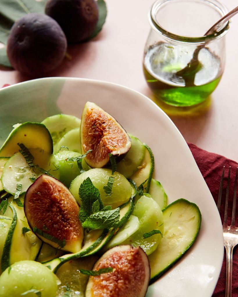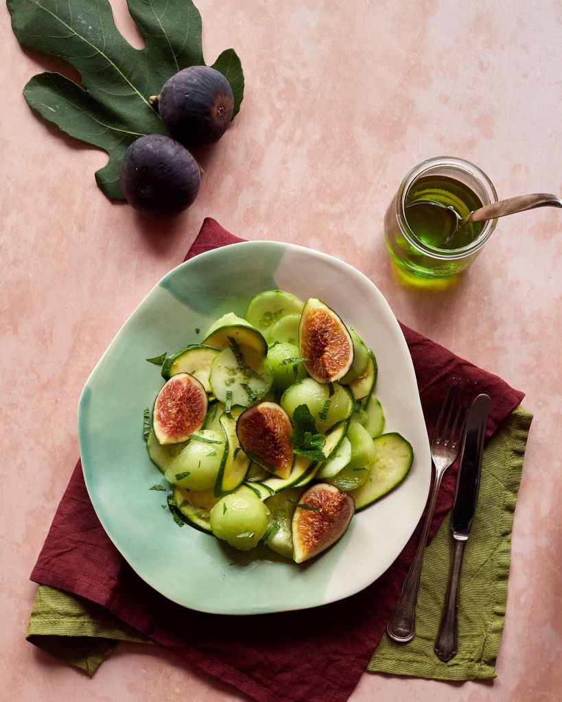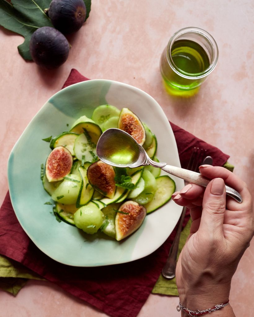 След като приготвих олиото, исках да го употребя в някаква рецепта и идеята за салата ми се стори най-подходяща. Салата със смокини, разбира се. Пъпешът, който е в пика на сезона си, любимите тиквички и краставица допълниха картината.