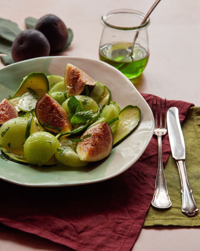 Нарежете пъпеша – аз пробвах да направя сфери, които не се получиха съвсем. Нарежете смокините на четири. Добавете плодовете при зеленчуците и разбъркайте. Сервирайте с прясна мента.
