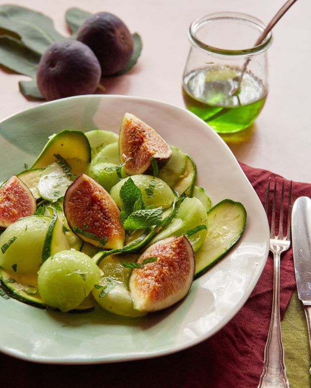 Нарежете пъпеша – аз пробвах да направя сфери, които не се получиха съвсем. Нарежете смокините на четири. Добавете плодовете при зеленчуците и разбъркайте. Сервирайте с прясна мента.