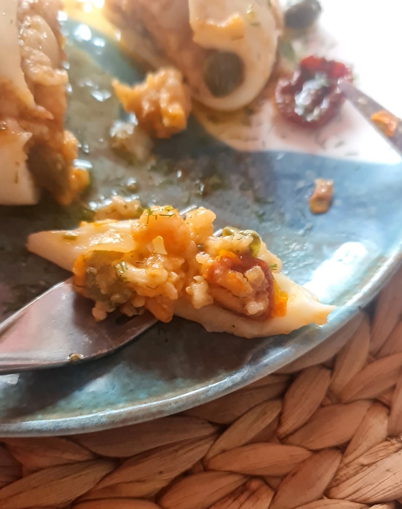 Лятото е най-подходящо за морски дарове. Пасват му някак си и са ми най-вкусни точно в тези месеци, макар и да са на разположение целогодишно. Днешната рецепта не е стриктно гръцка, но бих казала, че добре се вписва в тази традиция. За пълнежа се спрях на ориз, сушени чери домати и каперси които допринасят за средиземномрския вкус. Добавих и дребни скаридки, благодарение на които ястието има над 30 г протеин в една порция.