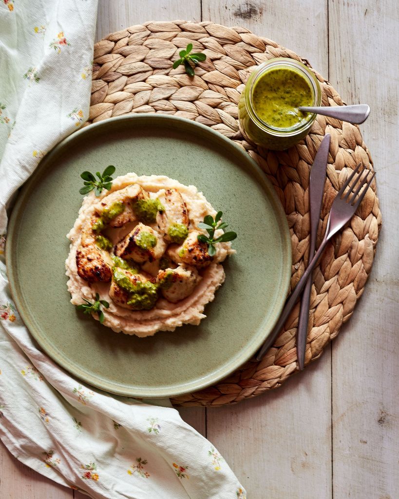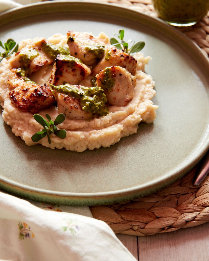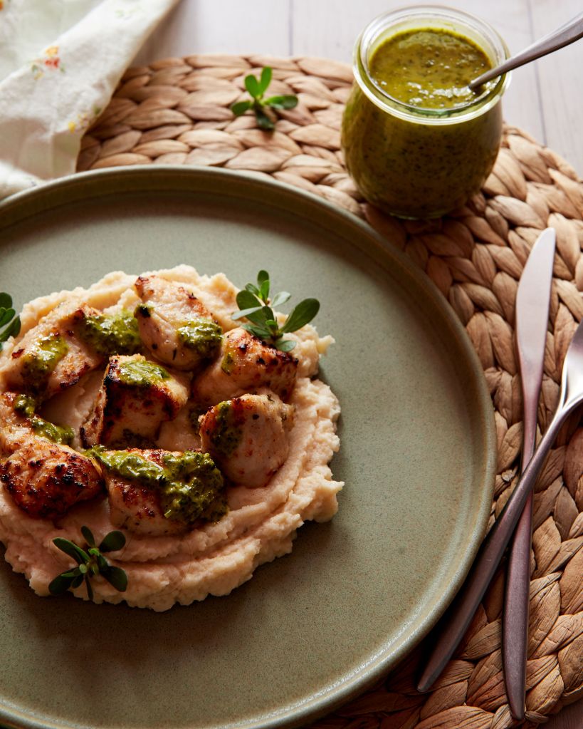Изпекох целината (отнема само 45 минути), след което я обелих и пасирах на пюре със сметана и масло. Месото мариновах с пармезан и кленов сироп. За да разчупя този хармоничен и леко сладък вкус, направих сос чимичури с тученица и малко повече лимон, отколкото в класическата версия. Резутатът? Идеалната хапка, която ще ви направи фенове до живот.