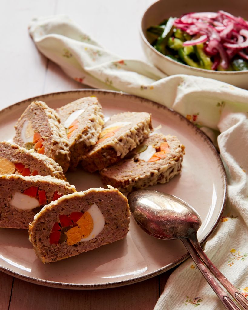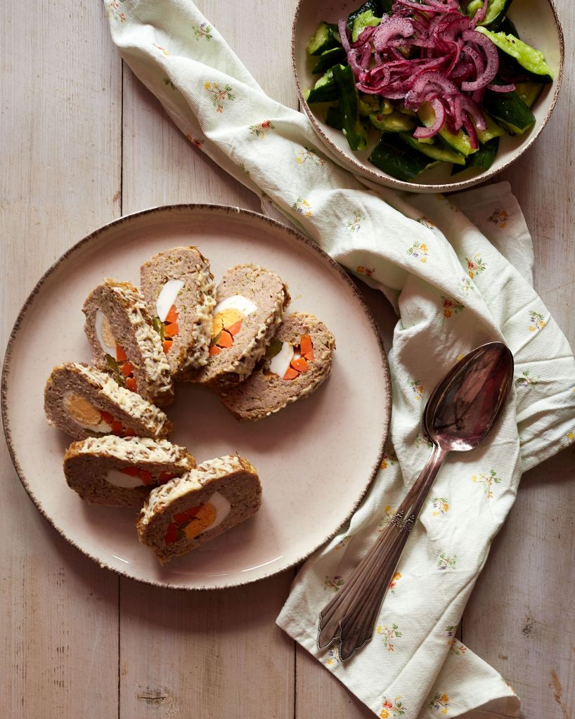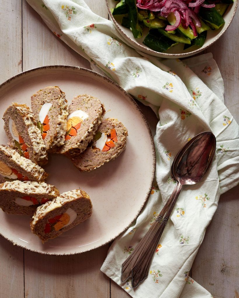 Това руло Стефани е с пуешко и настъргани отцедени тиквички. Пълнежът е такъв, какъвто го помня – варени яйца, моркови и кисели краставички. Ястието е вкусно, без да е сухо, заради тиквичките и има 44 г протеин в порция. Гарнитурата оставям на вашето въображение и наличности. Моята беше салата от „бити“ краставици и маринован лук.