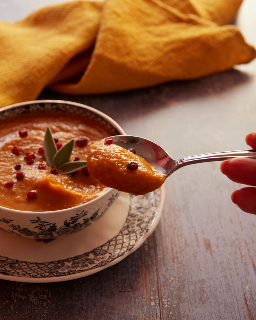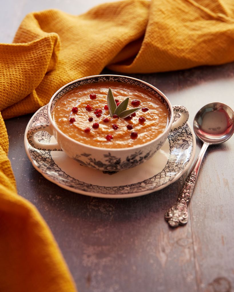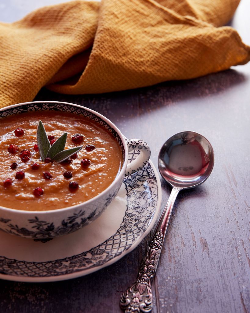 Какво е октомври без крем супа от тиква? Риторичен въпрос. Сигурна съм, че има рецепти в изобилие, но още една никога не е излишна. В тази тиквата е в компанията на кестени и червени боровинки – една от любимите ми комбинации. За повече плътност на вкуса добавих и целина.