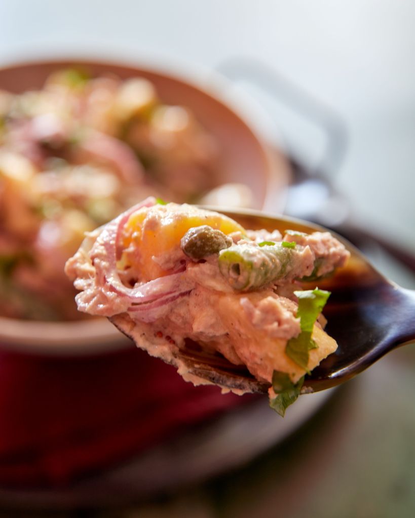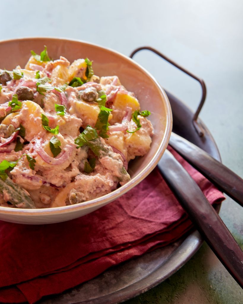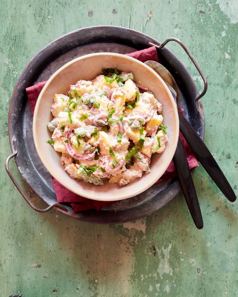 Студената картофена салата е много добра от диетична гледна точка, понеже сварените и охладени картофи се превръщат в устойчиво нишесте с много нисък гликемичен индекс. Добавяме френски боб за фибри, риба тон за протеин, маринован червен лук и каперси за вкус и имаме прекрасна комбинация.