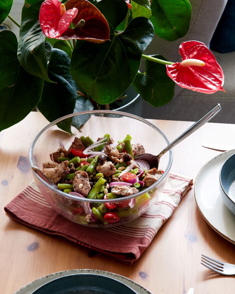 Френският боб, папудата и пуешкото може да се подготвят предварително. Ако ги правите на момента, салатата ще бъде топла. Ако не – ще е студена. И двете са много вкусни.