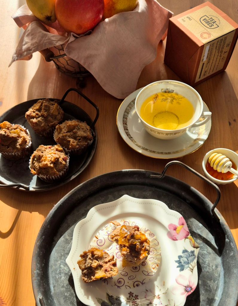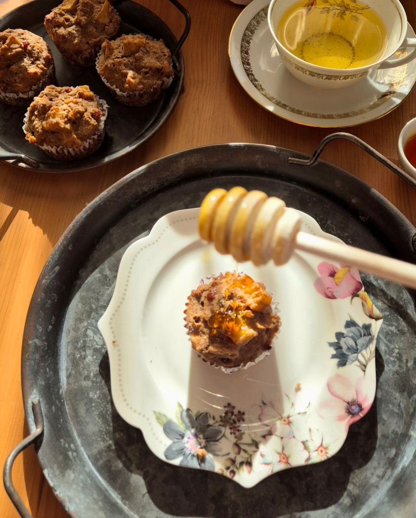 Загрейте фурната до 180 градуса и пригответе форма за мъфини с долен диаметър 5 см, горен диаметър 7 см и височина 4 см. Ако формата е силиконова, няма нужда да я намаслявате. Ако не е и ползвате кошнички, препоръчвам да ги намажете с неутрална мазнина. Разпределете сместа между гнездата и печете 25 минути. Изчакайте да изстинат и сервирайте с малко мед.