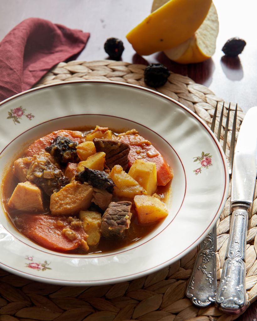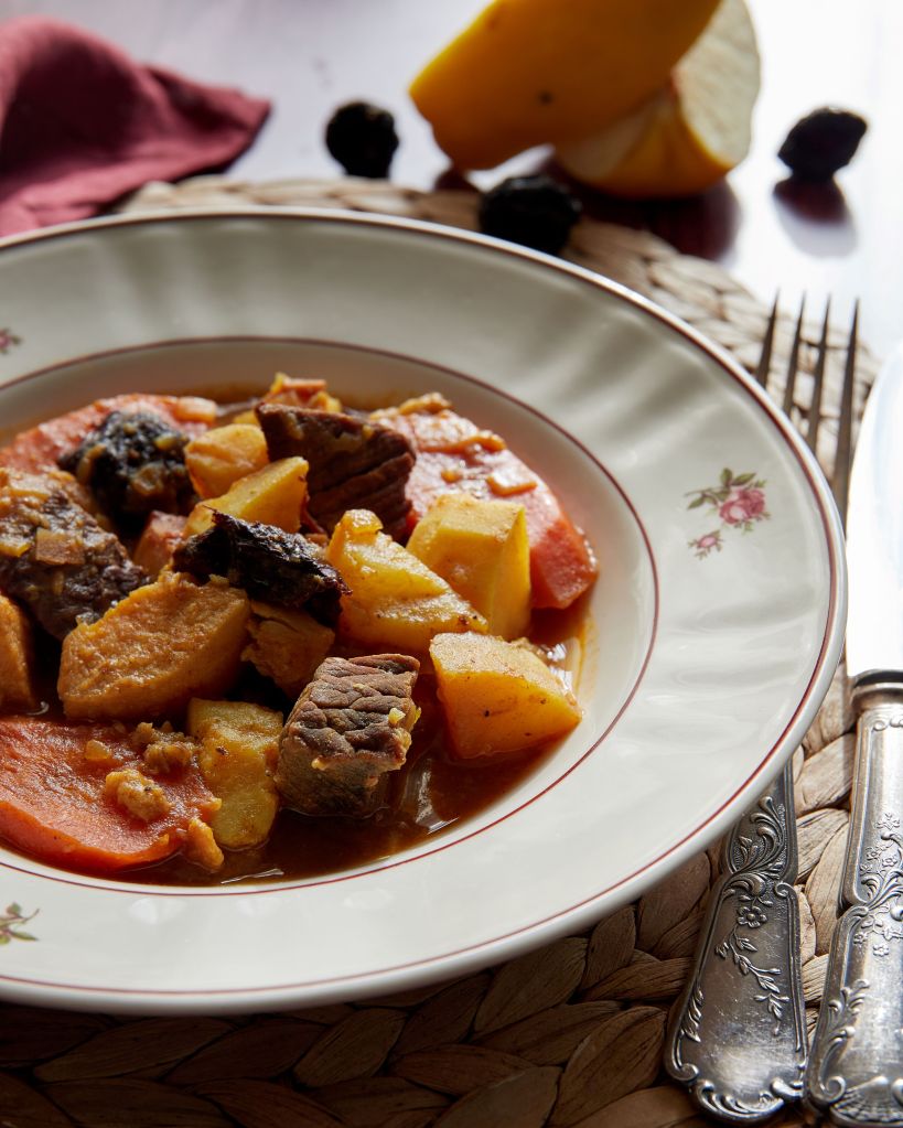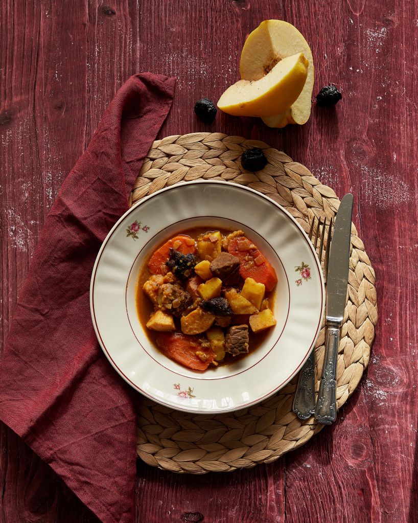 От beouf bourguignon запазих морковите, бульона и дафиновия лист. От khoresh-e-beh добавих бахара, дюлите, сините сливи и куркумата. Картофи съм срещата в различни версии и на двете изходни рецепти.