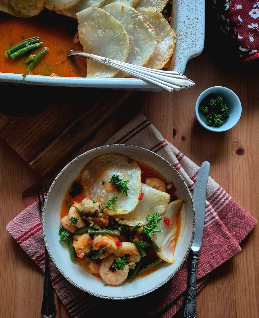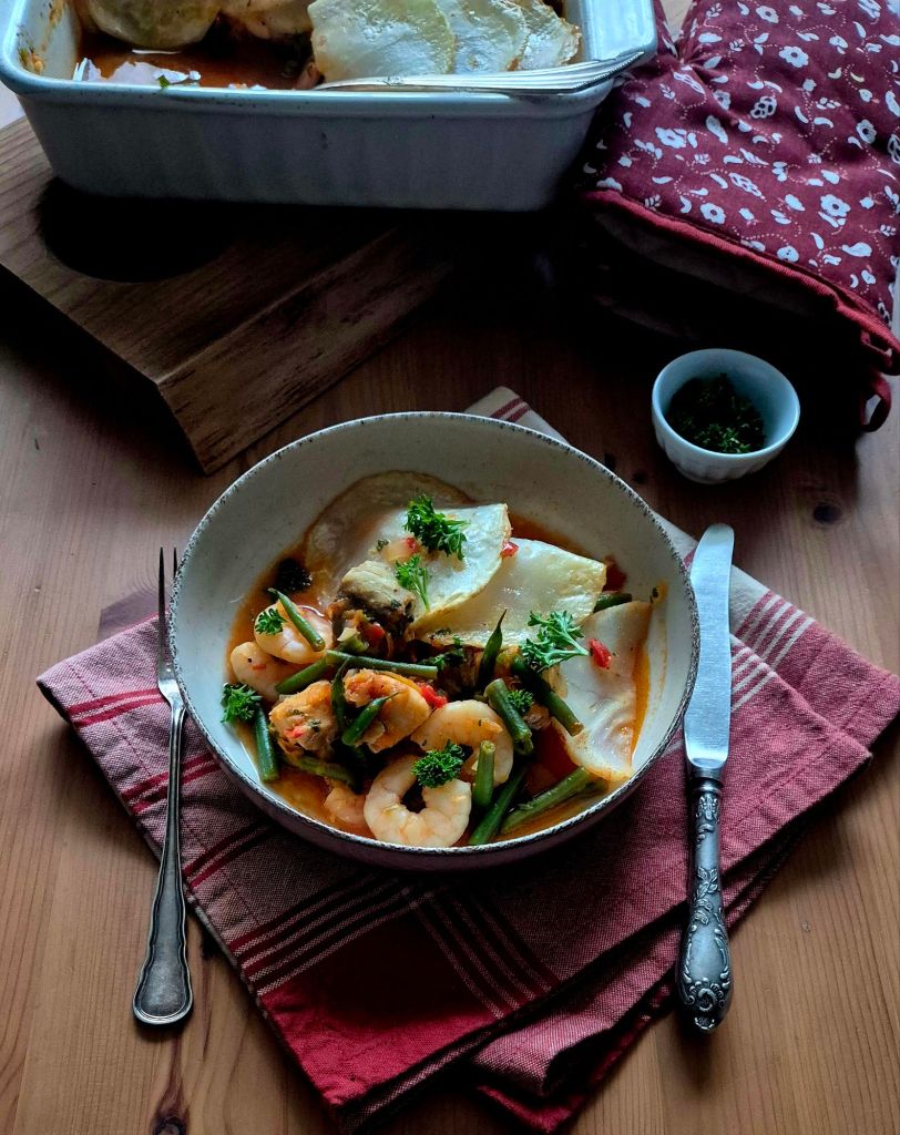 Исках да взема паламуд и да го филетирам, но не намерих. Приготвих я с треска и замразени бланширани скариди. Освен тях имаме лук, чесън, моркови, смлени домати, чушки и френски боб. Зеленчуците се задушават със зехтин. Рибата и скаридите се добавят накрая. Покриват се с предварително бланширана тънко нарязана целина, която можете да замените с картофи и се запичат на фурна.