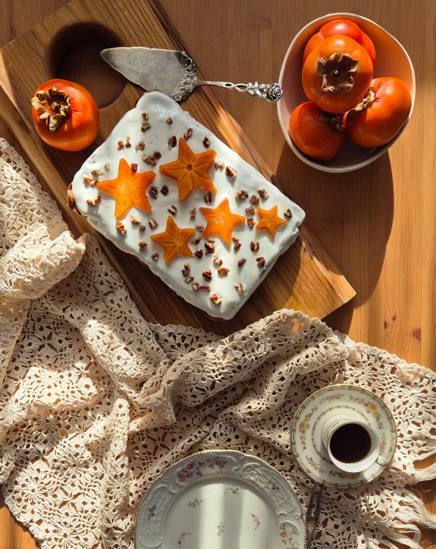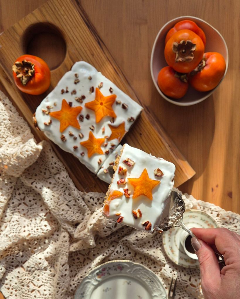 Смесете продуктите в блендер и разбийте добре. След като кейкът изтине, покрийте с глазурата и заравнете. Декорирайте според предпочитанията си. Аз изрязах форми от райска ябълка и поръсих с нарязан пекан.