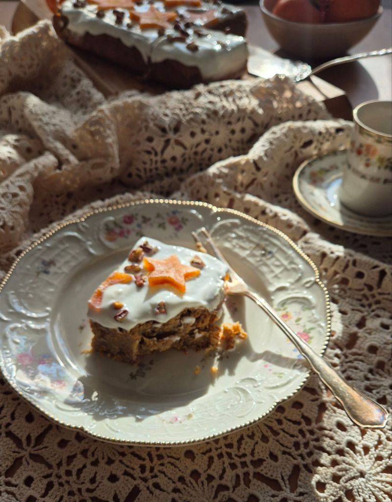 Десертът, който ви предлагам днес е сочен, много вкусен и изключително ароматен. За него използвах пюре от райска ябълка, подправено с канела и индийско орехче, което смесих с флейкс и брашно от елда. Добавените в тестото яйца и скир, както и глазурата от извара и скир осигуряват почти 10 г протеин във всяко парче.