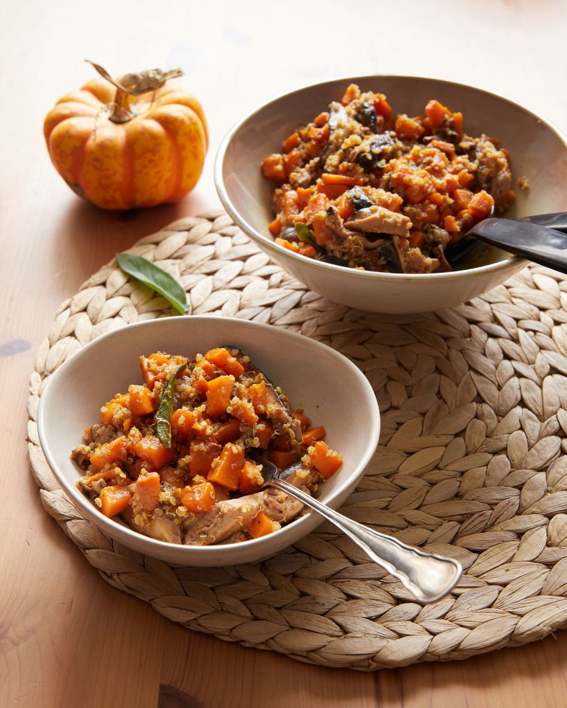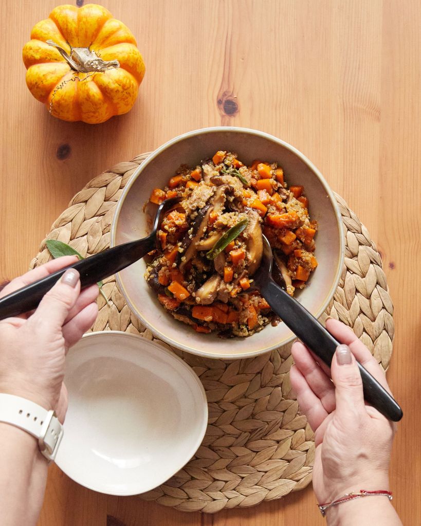 За нея ви трябва тиква, нарязана на малки кубчета и предварително изпечена в air fryer (или на фурна), предварително сварена киноа и гъби – моите са шиитаке. За богатия вкус се погрижиха малко мисо и прясна салвия.