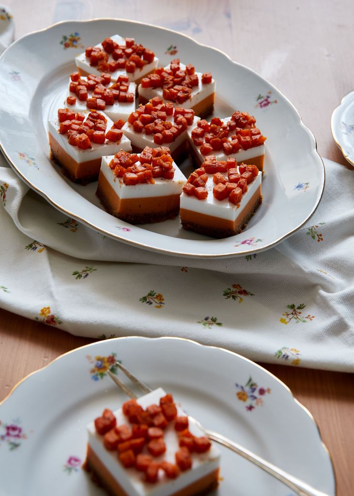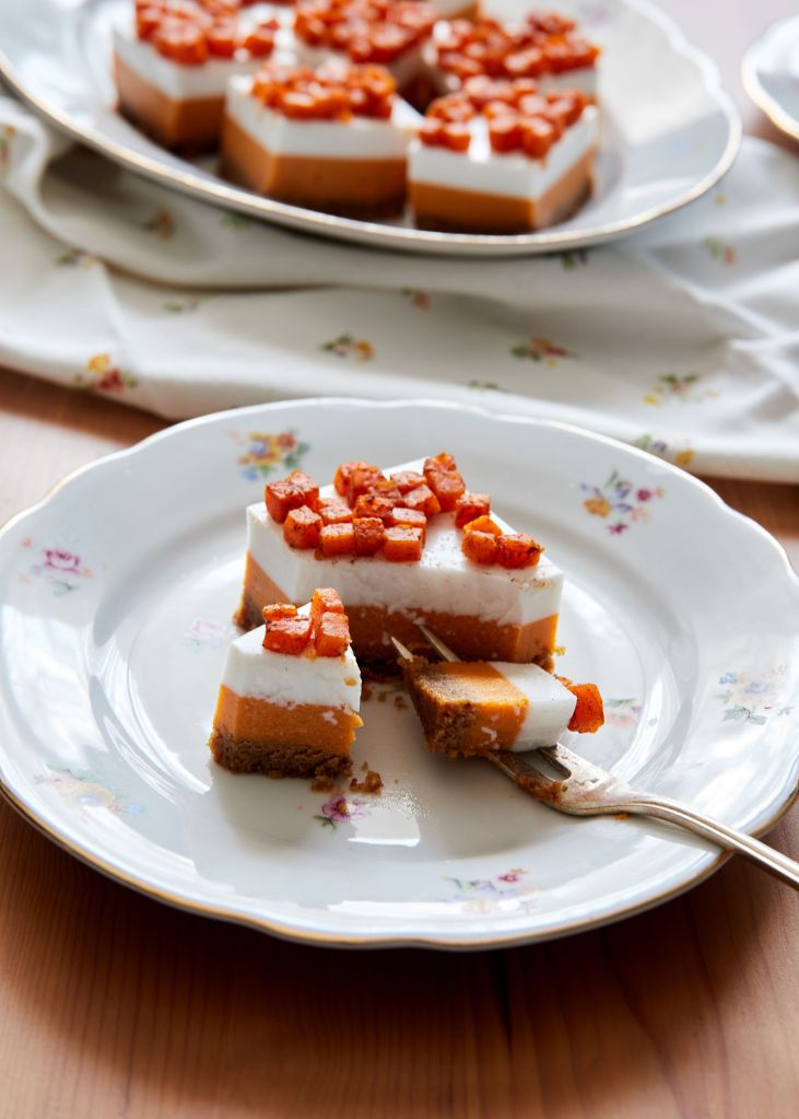 Този слой се добавя, когато предишният е стегнал. Ако се наложи за изчакате, разбърквайте от време на време (може да загреете отново, но без да стига температура над 40 градуса), за да не започне да стяга. Когато тиквеният слой е готов изсипете този врху него и върнете в хладилника са още 40 минути или докато стегне. Декорирайте според желанието.