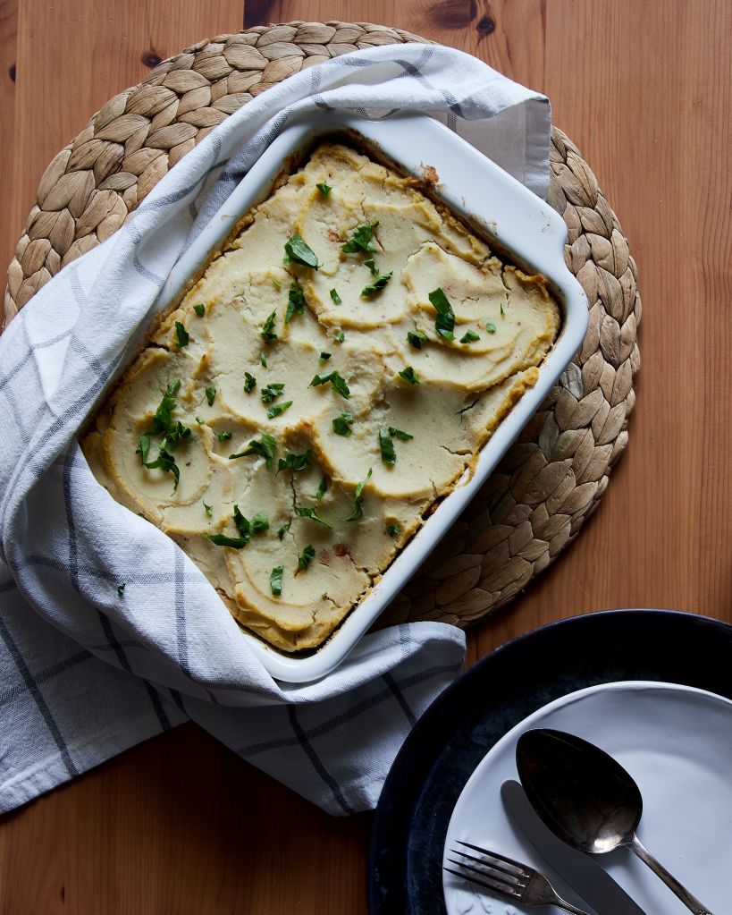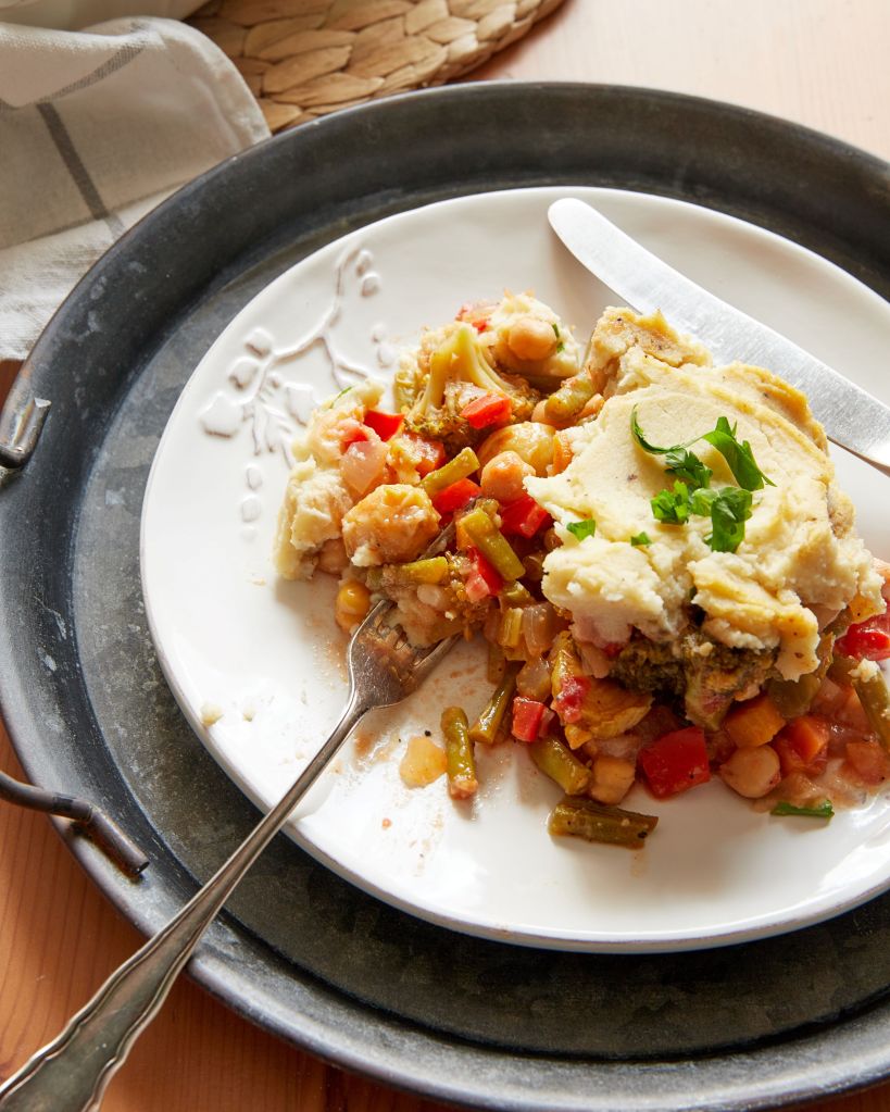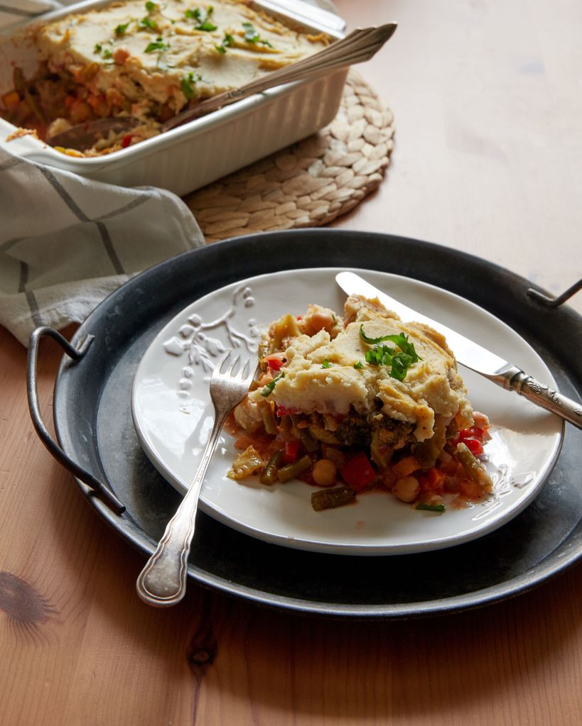 Наскоро видях рецепта за алтернативен овчарски пай с пуешко месо и пюре от карфиол и това ми даде идея за начина, по който мога да оползотворя няколко отлежаващи зеленчука. Имах глава целина, малко брюкселско зеле, френски боб и броколи. Добавих им моркови, червени чушки, стрък селъри, лук и домати. Вместо месо, сложих нахут. Всички зеленчуци, с изключение на целината, задуших със зехтин, а нея сготвих на пара и направих на пюре. Няколко минути във фурната за приятен загар на пюрето завършиха ястието.