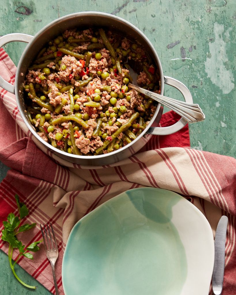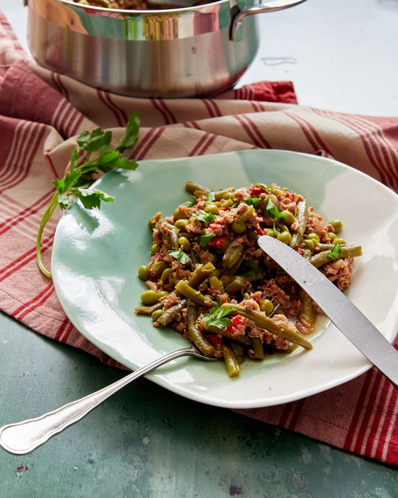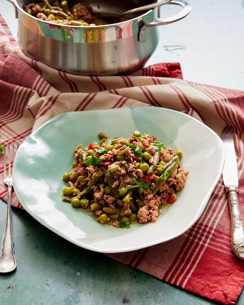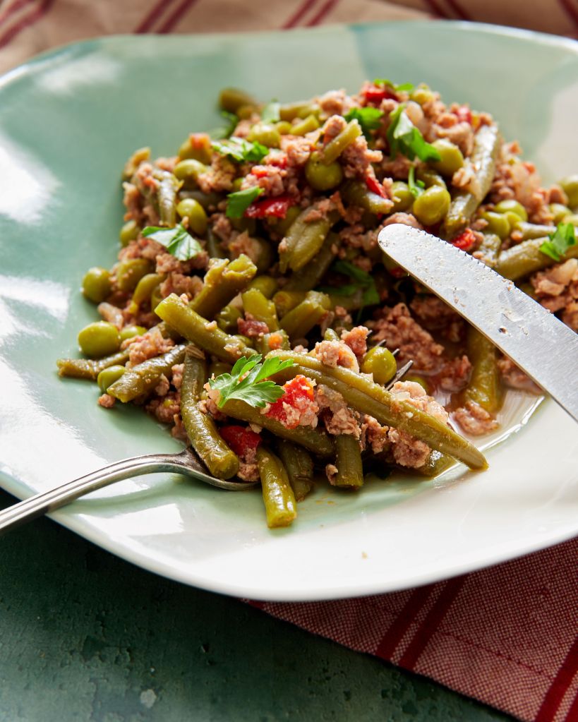 Използвах замразени грах и френски боб и консервирани домати. Овкусих с дафинов лист, семена от фенел, прясна мащерка и пресен магданоз. Всички продукти са лесно достъпни и приготвянето е много бързо. Ястието понася претопляне и можете да го направите предварително, така че да ви е под ръка в момент, когато нямате много време за готвене.