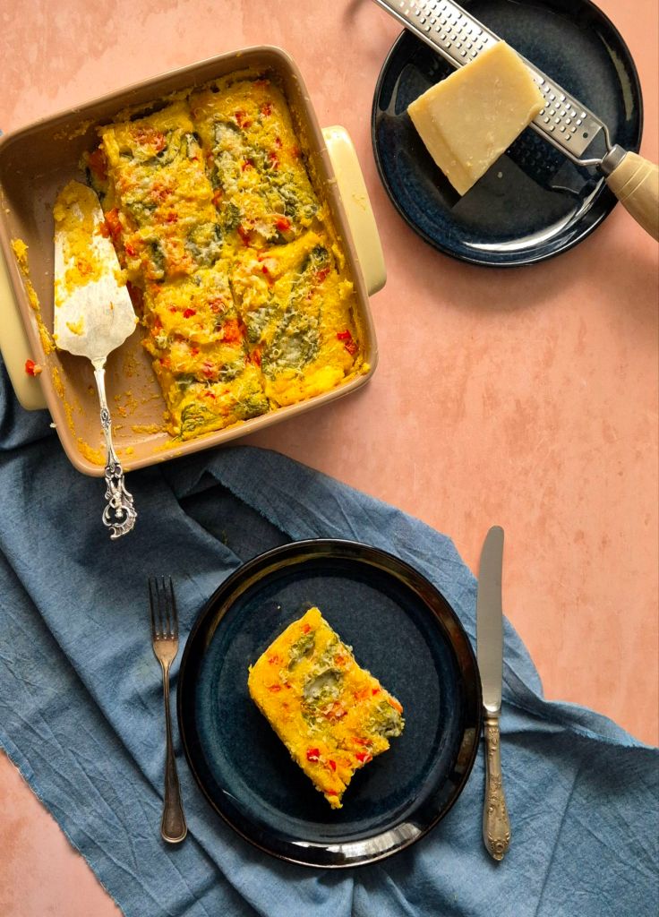 Извадете тавата с тиквата от фурната и добавете полентата и нарязаната чушка. Разбъркайте, за да се разпределят добре. Добавете спанака и притиснете леко в полентата. Върнете във фурната и печете 10 минути на ниско ниво. Поръсете с останалия пармезан и печете още 10 – 15 минути на средно ниво. Извадете от фурната и оставете за около 30 минути, за да стегне, преди сервиране.