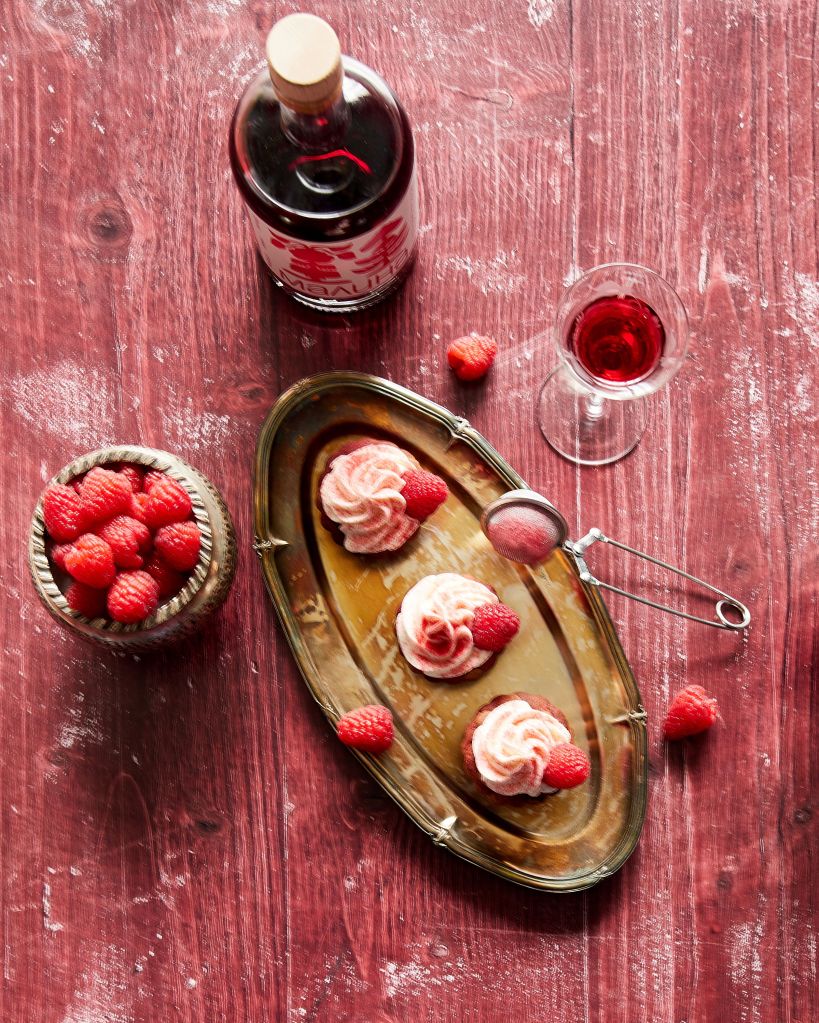 В малък съд загрейте малините с около 40 – 50 мл вода. Гответе, докато се разпаднат и след това прецедете – трябва да излязат около 70 мл сок. В купа смесете малиновия сок, зехтина, скира, разредения ликьор и ванилията и разбийте на ръка (може и с миксер, но според ме не си заслужава).