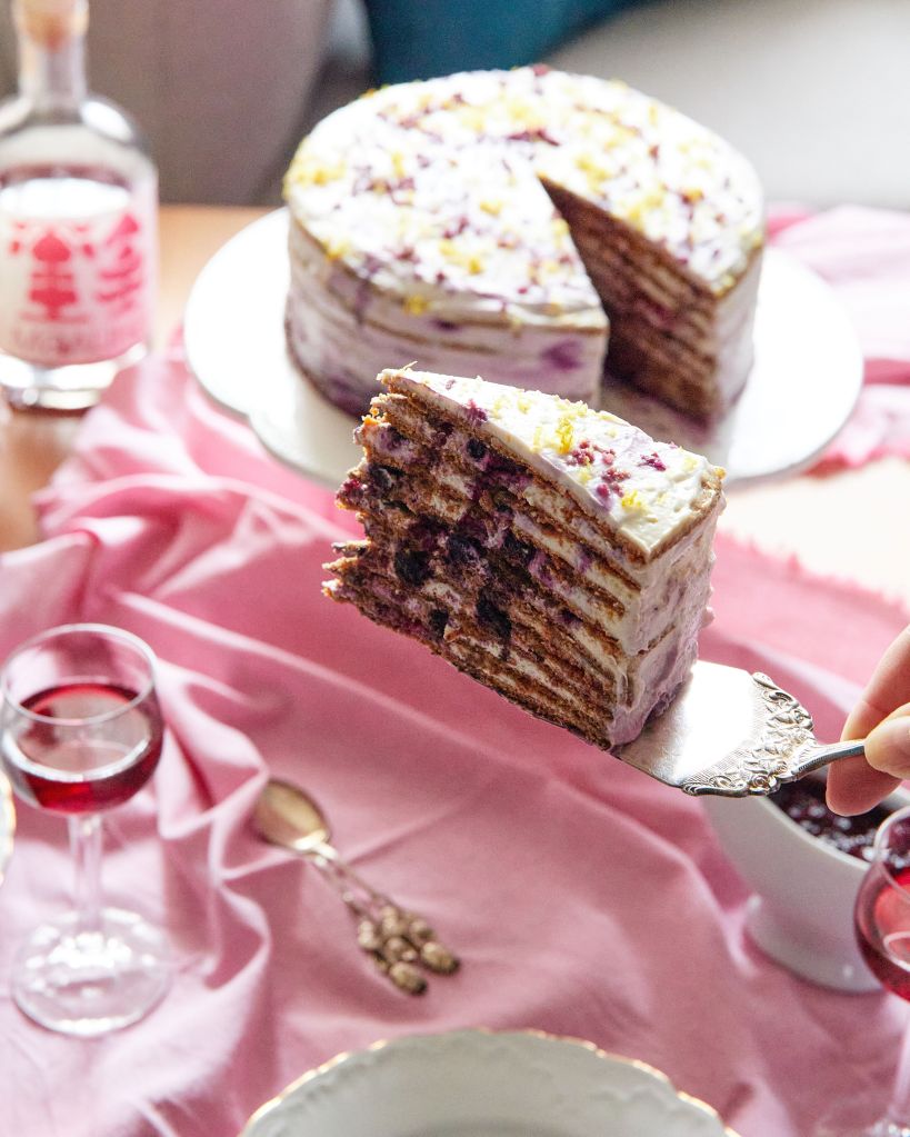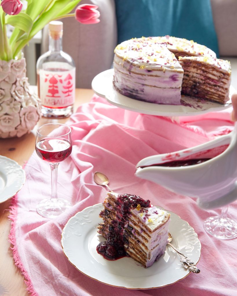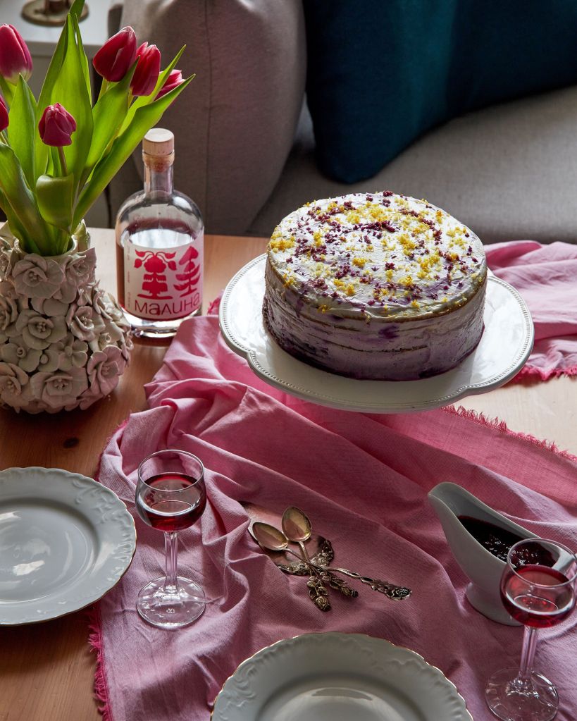 Тази торта е вдъхновена от любимото ми Малиново момиче на Цукерня Савенко. И другите торти на Ани ми харесват, но тази говори директно на душата ми. Не съм питала за рецептата и не съм се опитвала да я пресъздам едно към едно. Но, когато реших да направя торта за празника, някак естествено се спрях на подобен формат – тънки блатове и лек крем.