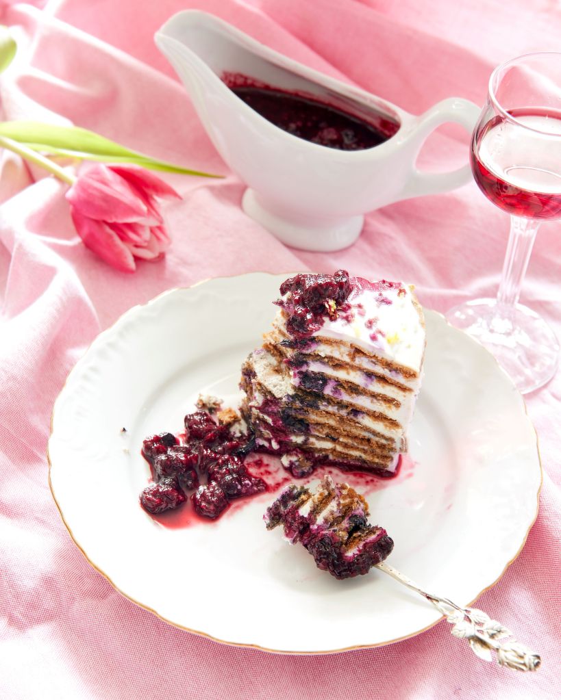 За основа използвах една рецепта за т.нар. френска селска торта, или по-точно медовик, с добавено боровинково сладко между блатовете. Технологията на приготвяне е идентична, но продуктите са различни. Замених брашното със смес от елда и лупина, меда с петмез от рошкови, заради топлинната обработка, маслото със зехтин и част от млякото с ликьор от малини на 2 Лета. За крема ползвах отцеден скир и малко сметана, а вместо сладко, смесих размразени малини и боровинки с еритритол.