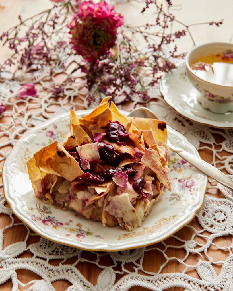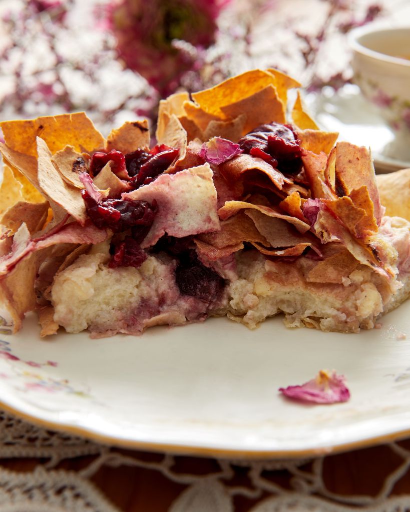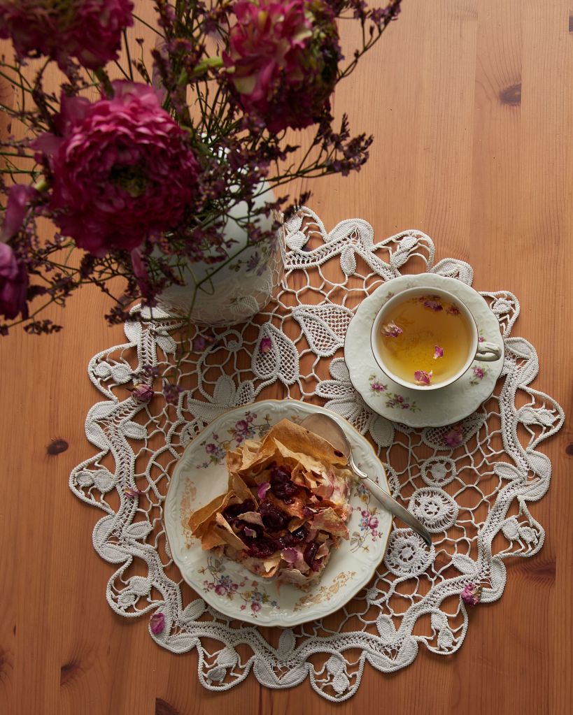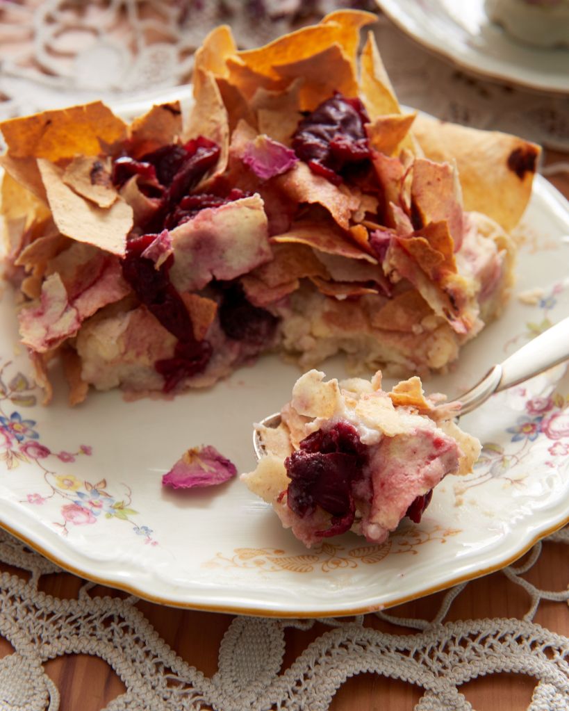Направих основа от ръчно точена кора и напълних с крем с грис, подобен на този за бугаца. Добавих част от вишните в крема и завърших с юфка. С останалите вишни направих нещо като кули с розова вода (комбинацията е позната от персийската кухня и е наистина много сполучлива), което добавих след изстиване на печивото.