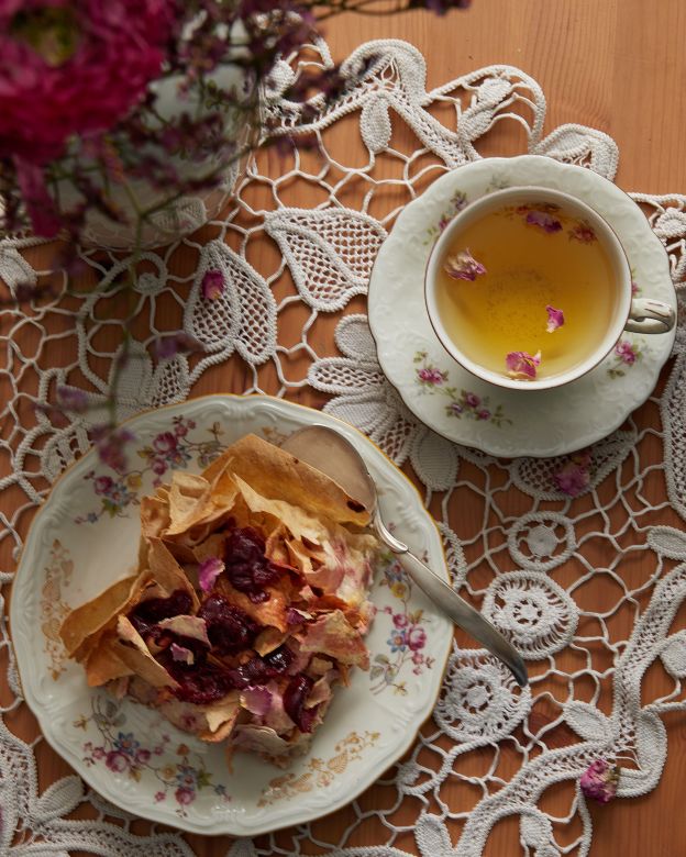 През това време пригответе кулито, като загреете останалите вишни с еритритола и варите около 5 минути. Можете да пасирате грубо с ръчна преса за картофи. Добавете розовата вода и свалете от котлона. Разпределете върху баницата и декорирайте с листенца роза.