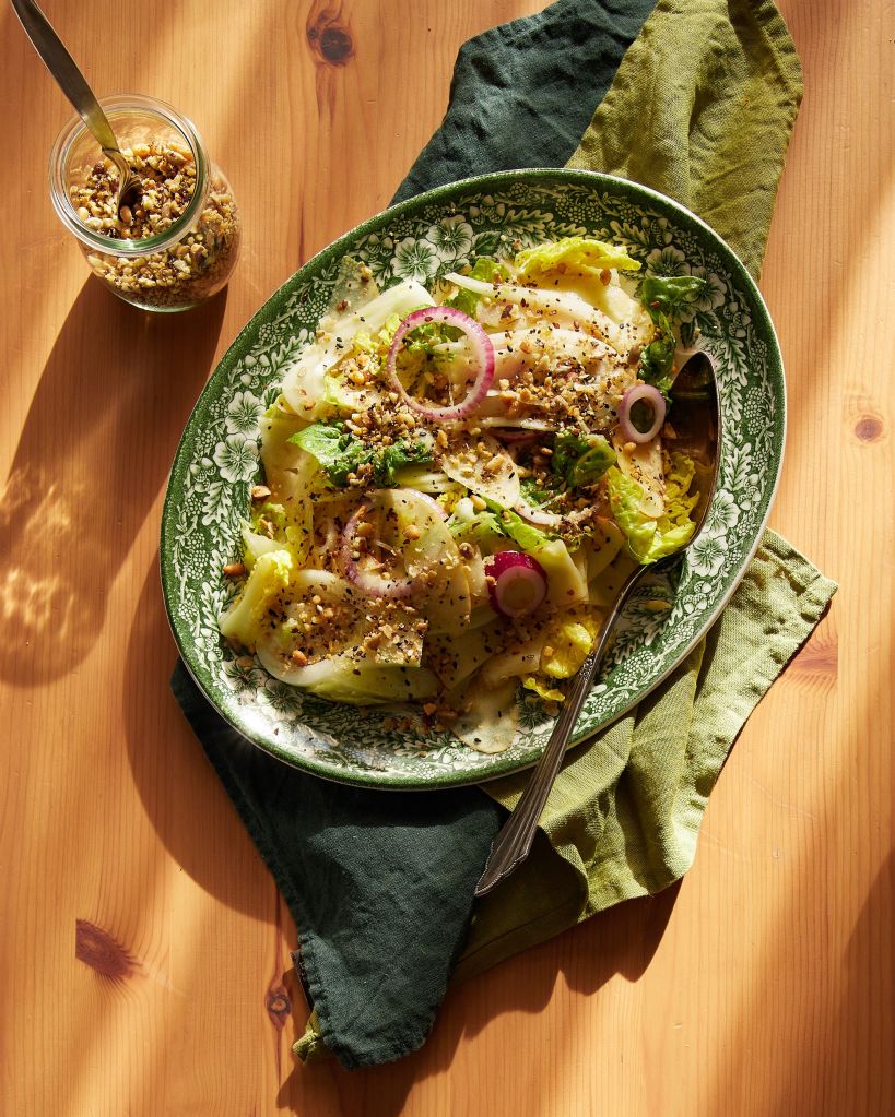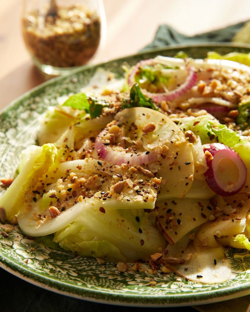 Накъсайте салатата в купа. Нарежете фенела и ябълката на тънки резени и добавете при салатата. Когато маринованият лук е готов, добавете него и пригответе соса. Залейте и разбъркайте салатата. Последно добавете поръската от семена и ядки.