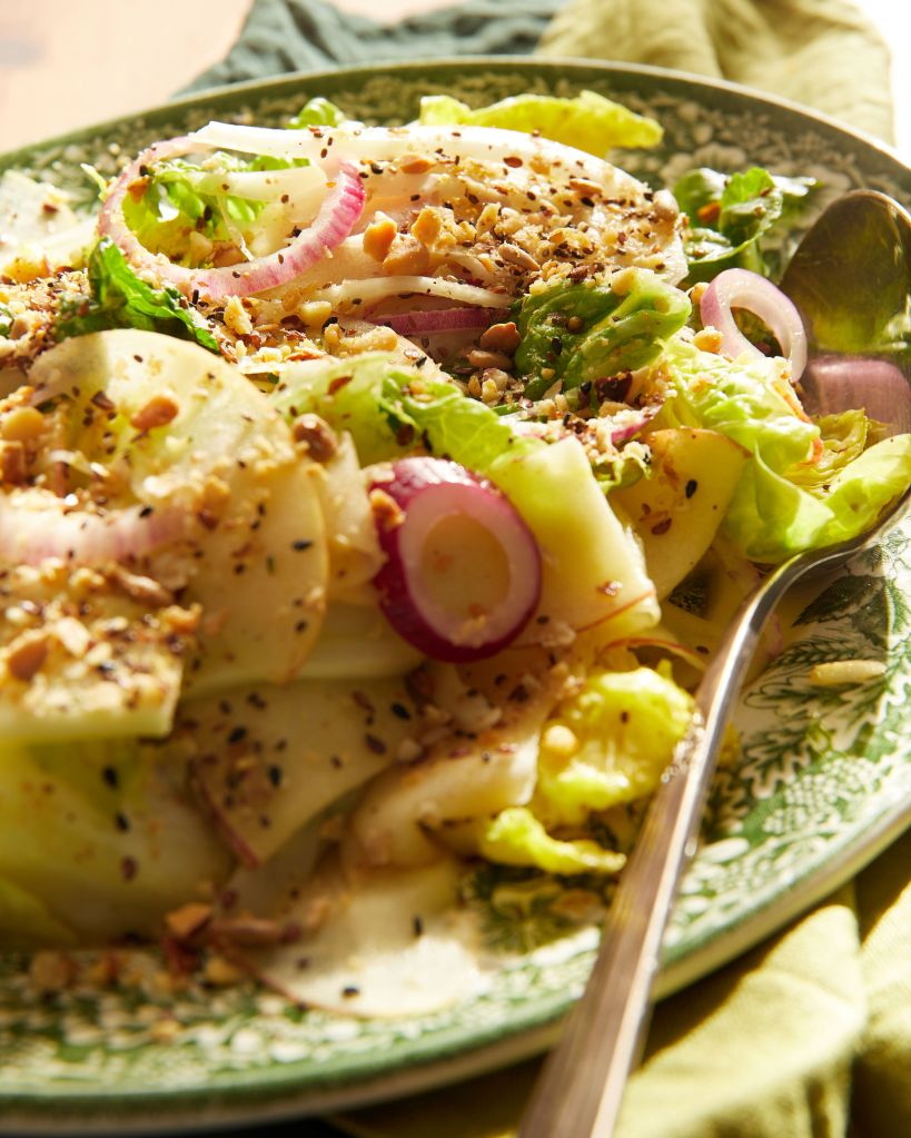 Днешната салата е лесна и бърза и е идеална гарнитура за риба и леки меса (пилешко или пуйка). Хрупкава, с леко сладка нотка от ябълките и приятна соленост от поръската, това е много свежа комбинация от вкусове, която ще ви сприятели с фенела, в случай че все още не се познавате.