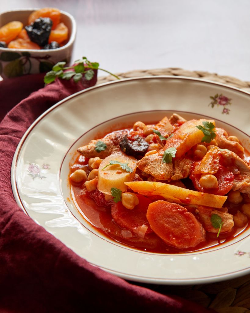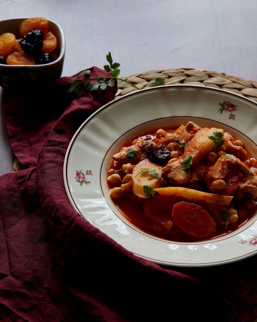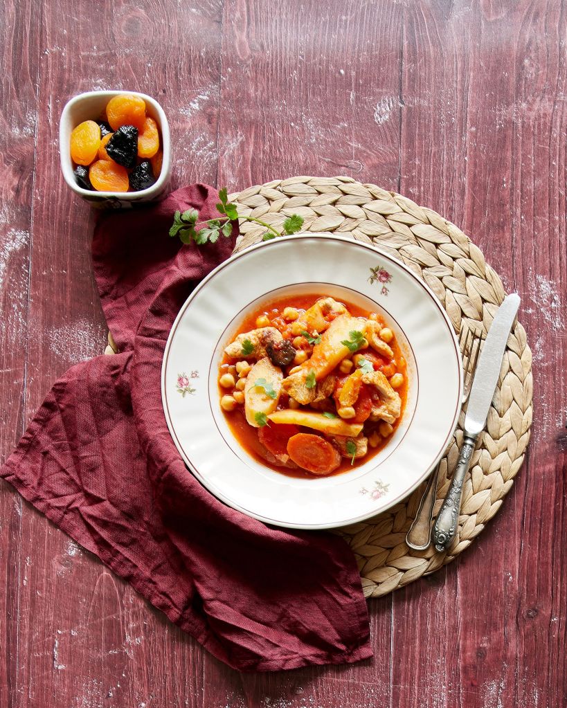 За това ястие използвах късчета пуешко месо от гърди. Съчетах го с моркови, пащърнак и нахут. Специфичният регионален вкус се постига с верните добавки и подправки. В случая най-добрият избор би бил рас ел ханут, но аз нямах и замених с бахарат. Мароко е представено от сушените кайсии и сливи и пресния кориандър.