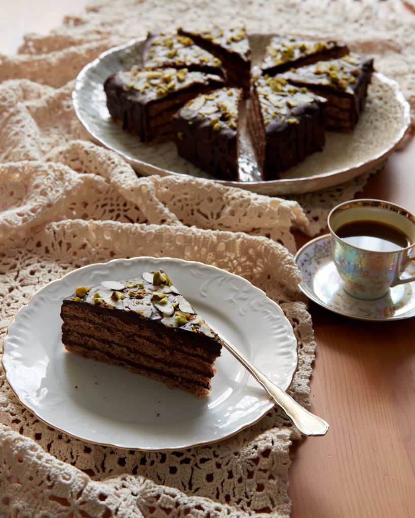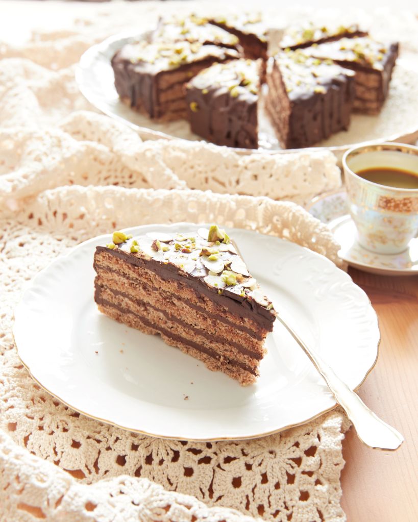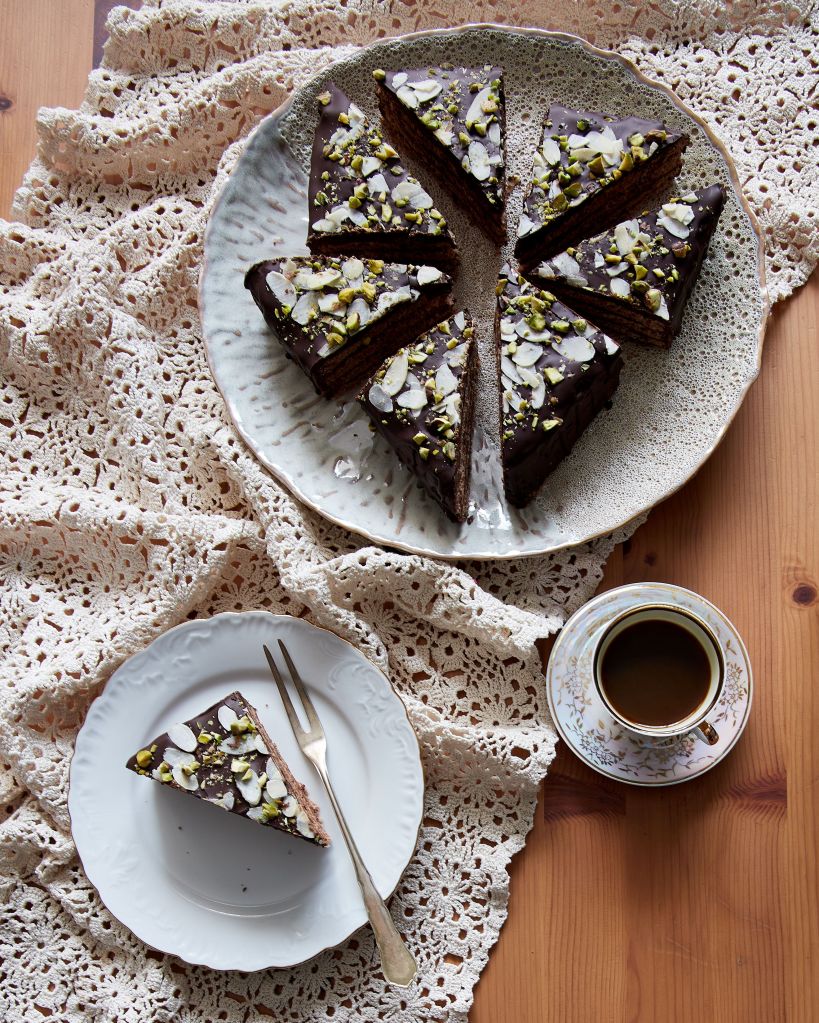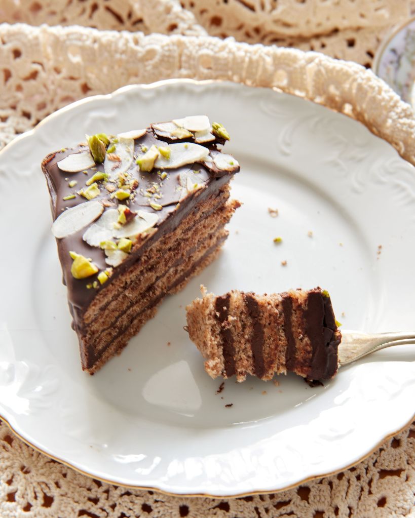 Декорирах тортата с филирани бадеми (като реверанс към оригинала), но добавих и малко шам фъстък. Относително скромна външност, под която се крие изключително наситен шоколадов вкус.