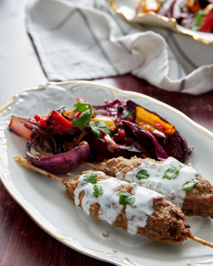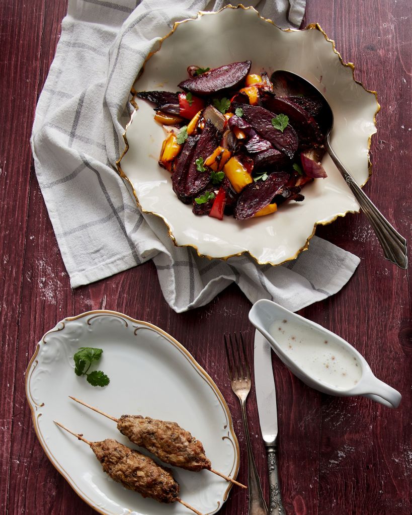 Една рецепта, в която ви обещавам, че ще се влюбите, стига диетата ви да включва месо. Ястието е не само вкусно, но и много хранително. Повлияно е от близкоизточната кухня и една порция ще ви осигури 36 г протеин и 8 г фибри. Ярките цветове на печените чушки, червен лук и червено цвекло го правят и много приятно за окото.