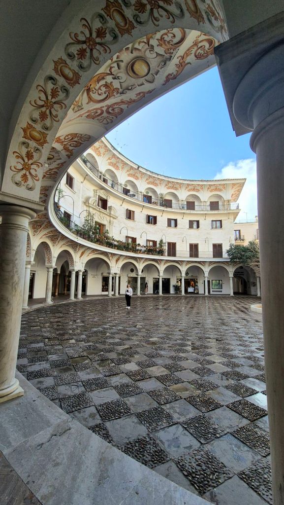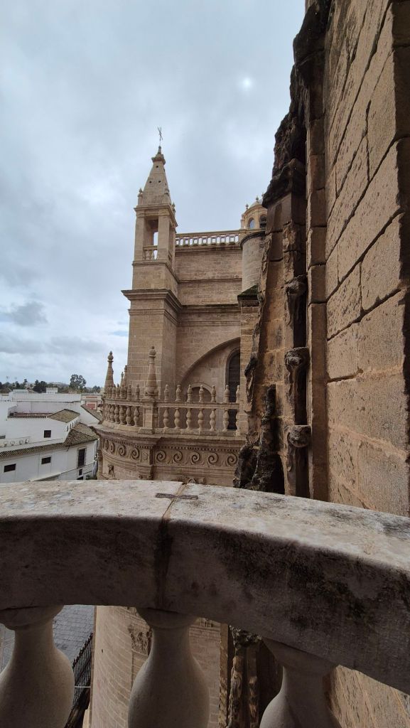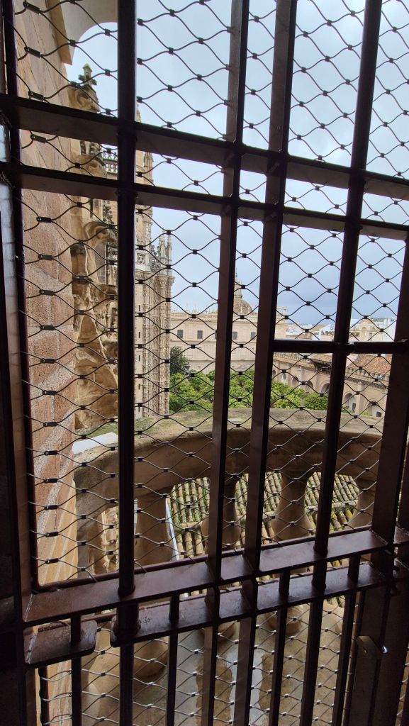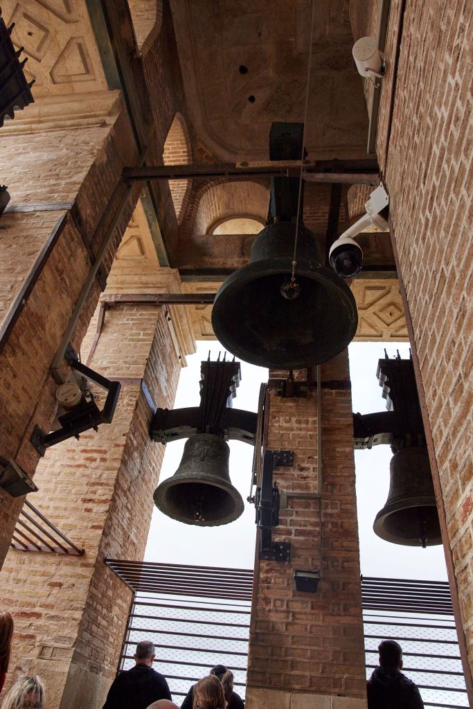 За разлика от другите камбанарии, които съм виждала (във Флоренция и Пиза), тази е значително по-широка – двама души спокойно се разминават. Вместо стълби има 35 рампи до първото ниво, където са камбаните. Това прави изкачването и слизането много по-лесни. Тази особеност се дължи на арабския произход – когато кулата е била минаре на джамията, мюезинът се е изкачвал до върха, за да призове към молитва, на кон.
