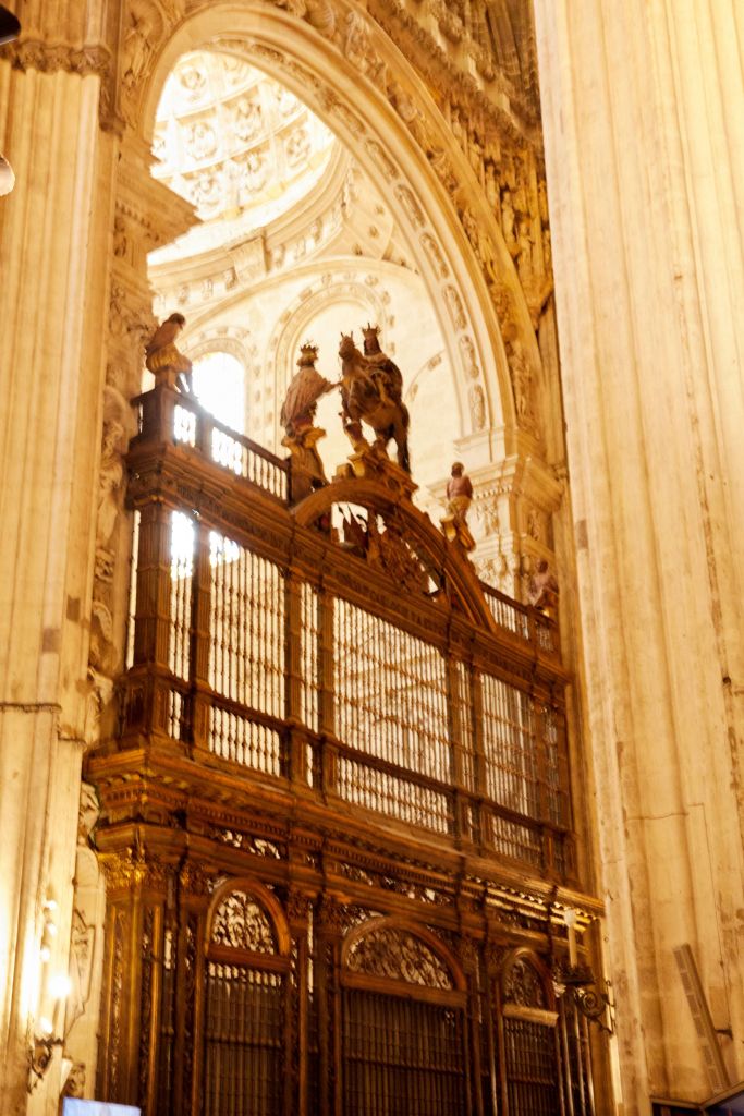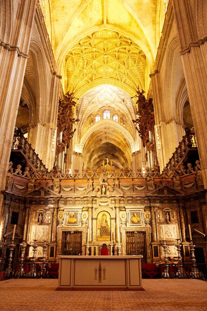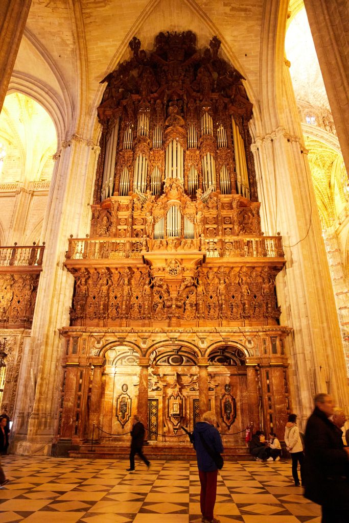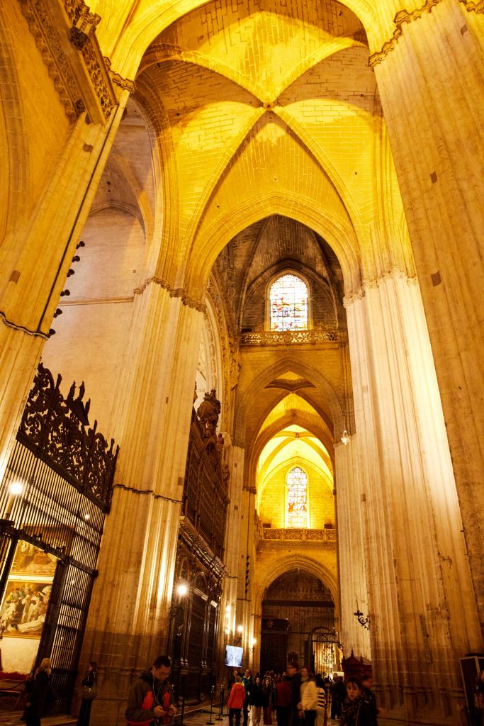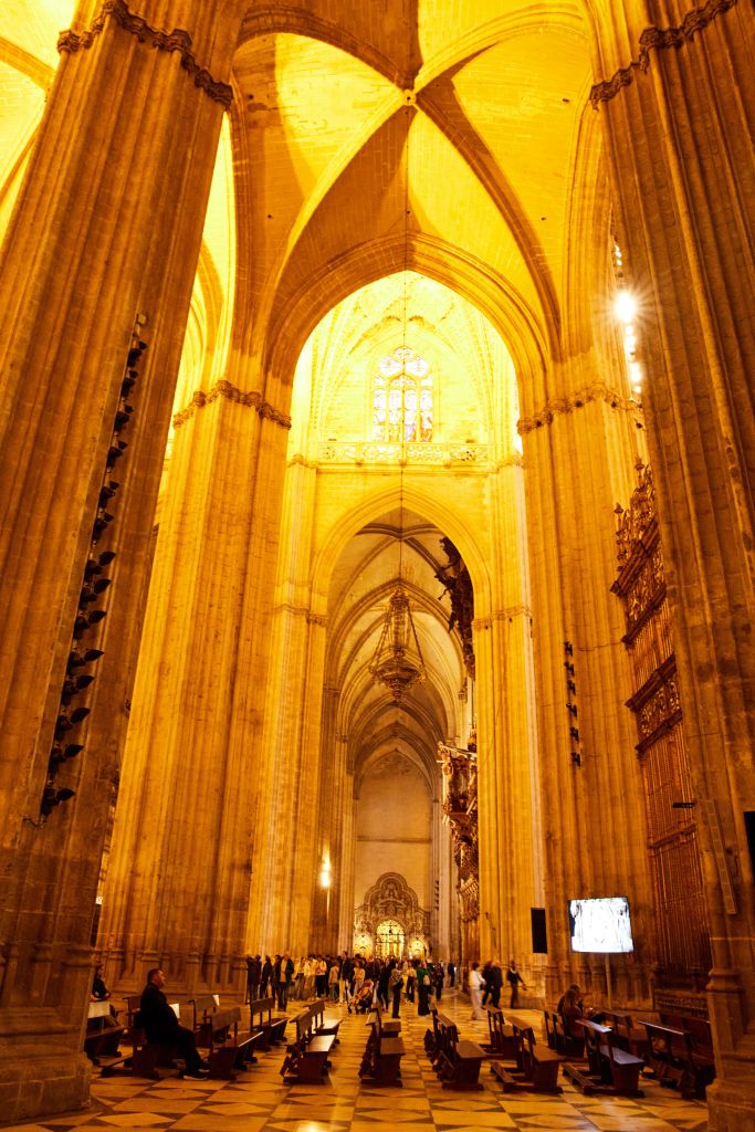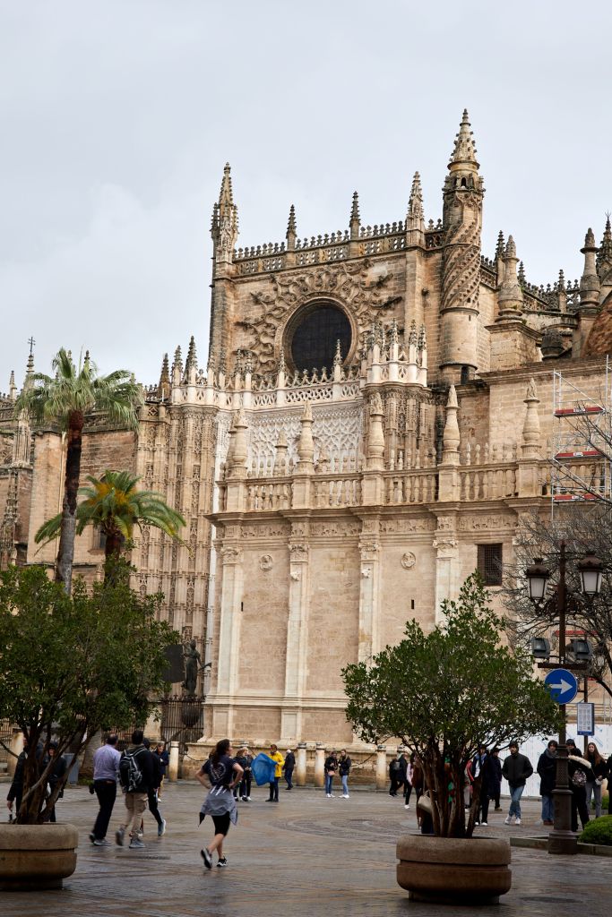 Катедралата на Севиля е най-голямата готическа и четвъртата по големина в света (без оглед на стил и време на построяването). Преди нея са само Св. Петър във Ватикана, катедралата в Апаресида, Бразилия (построена през втората половина на 20ти век) и Миланската катедрала. Строежът отнема целия 15ти век и е на мястото на съществуваща преди това джамия, което е било стандартна практика за времето. Сградата е правоъгълна, което не е точно по канон (катедралите обикновено са с форма на кръст). Катедралата е много богато орнаментирана и украсена. Градската легенда твърди, че, когато са започвали строежа, намерението на местните е било да „построим църква толкова красива и грандиозна, че тези, които я видят готова, да ни помислят за луди“. Имайки предвид, че строежът е завършен в самото начало на 16ти век, мисля, че са успели.