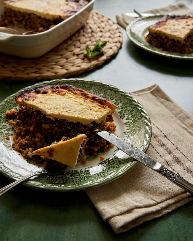 Това, честно казано, не знам как да го нарека. Като форма напомня мусака и дроб сарма със заливка. Като съдържание не е нито едното, нито другото. Има мляно месо (пуешко) като мусаката, но няма картофи или друг подобен зеленчук. Има зърнено (лимец вместо ориз), но няма дроб. Като цяло е хибрид между няколко общо взето класически ястия и може би точно затова е изключително вкусно.