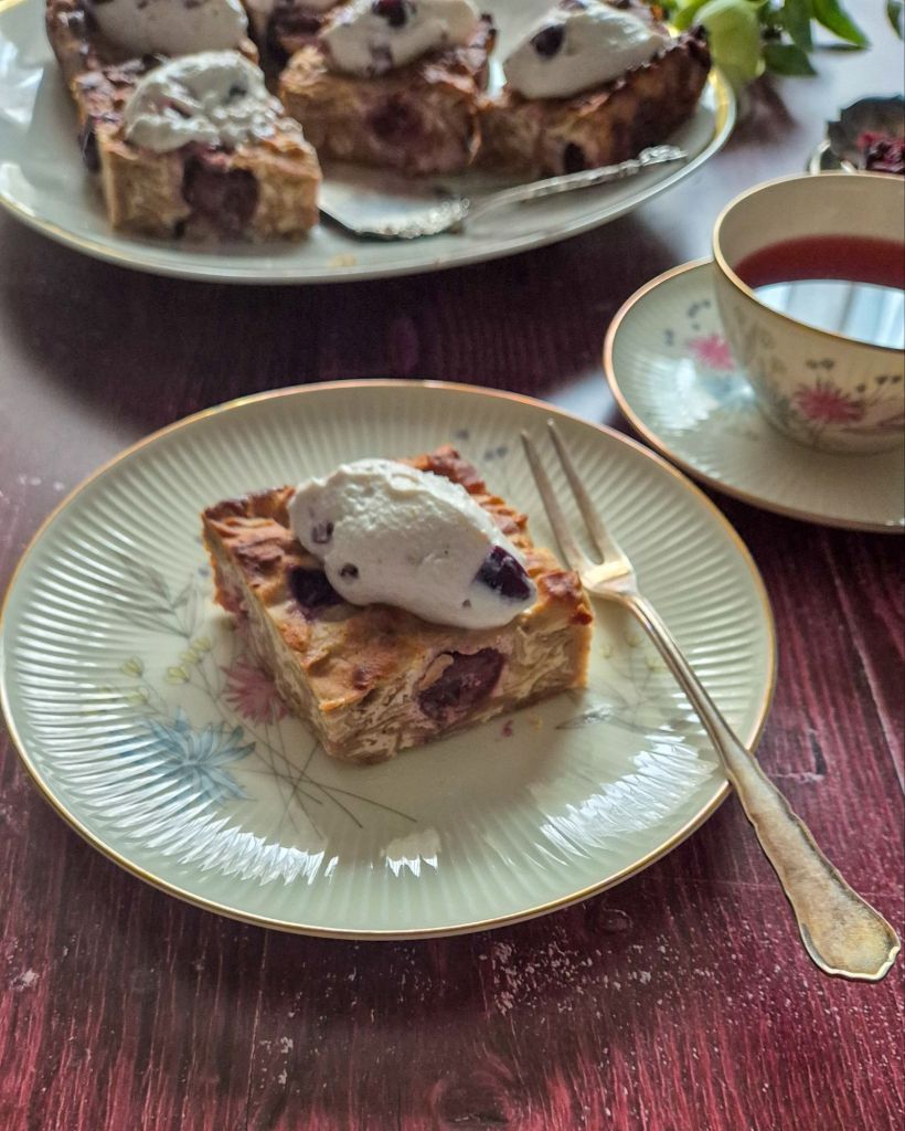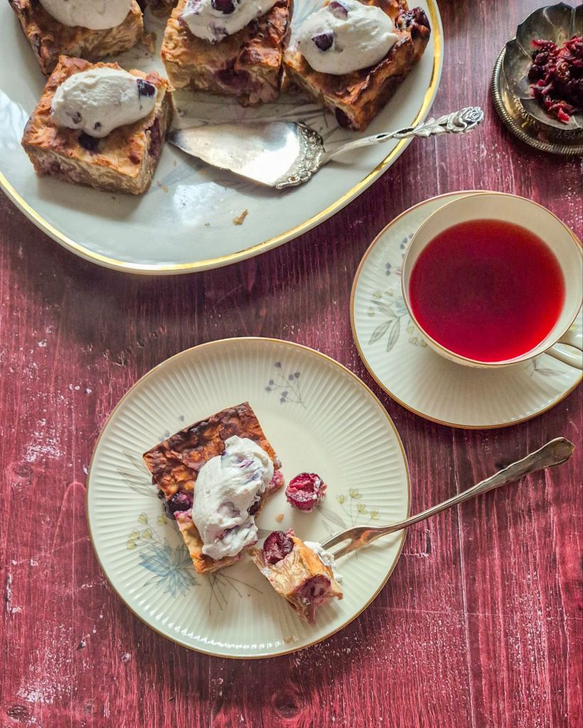 Оставете за 10 минути да почине и добавете размразените и отцедени череши. Разбъркайте и прехвърлете в тавата. Печете 60 минути и извадете да изстине, преди да нарежете.