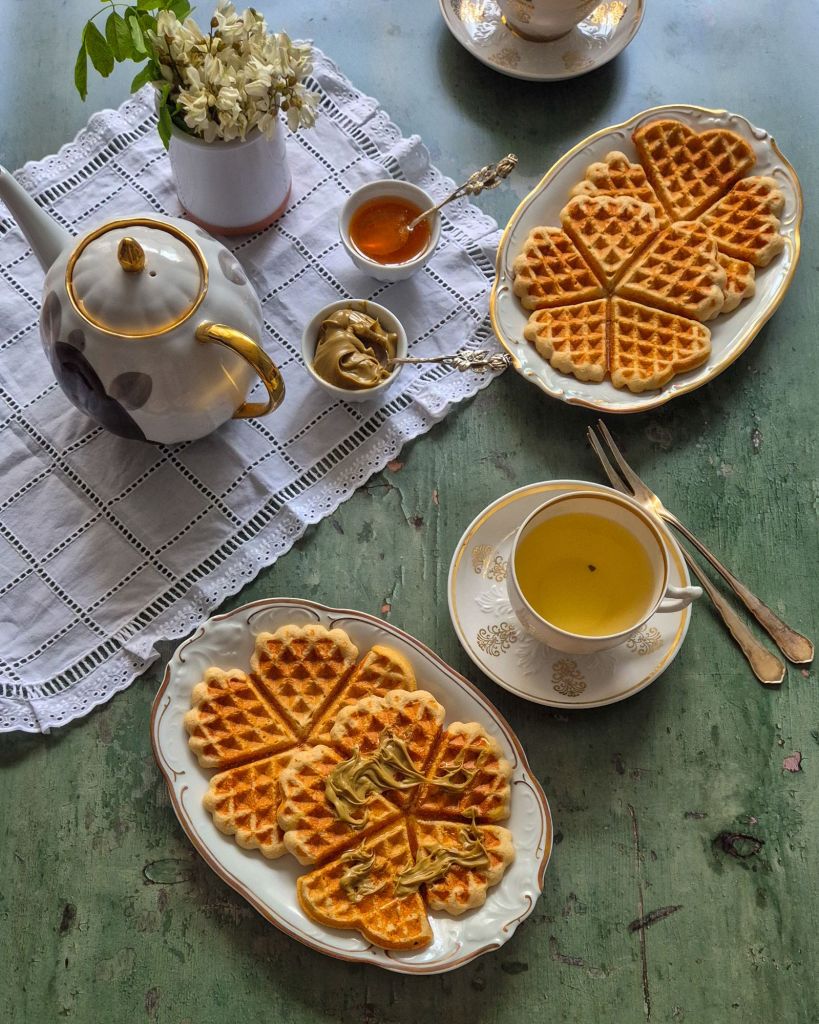 Дългият уикенд около 24ти май беше много хладен и дъждовен. Идеален за излежаване и късна закуска с гофрети. Този път в пролетен вариант с ароматни цветове от акация.