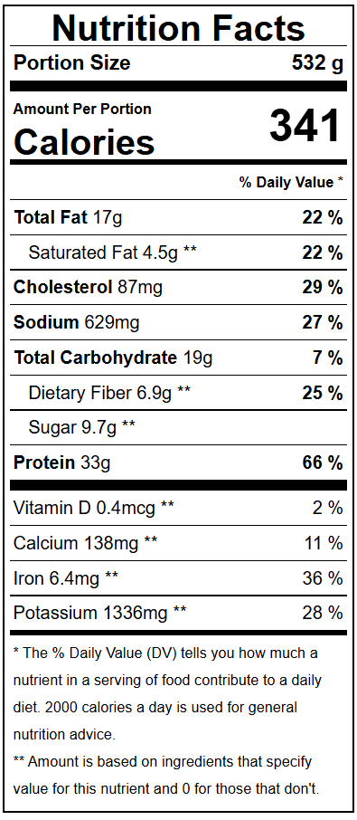 Пълна импровизация, понеже не беше от планираните рецепти, които обмислям предварително, но много вкусно, сезонно и хранително (33 г протеин на порция) и същевременно само с 340 калории на порция.