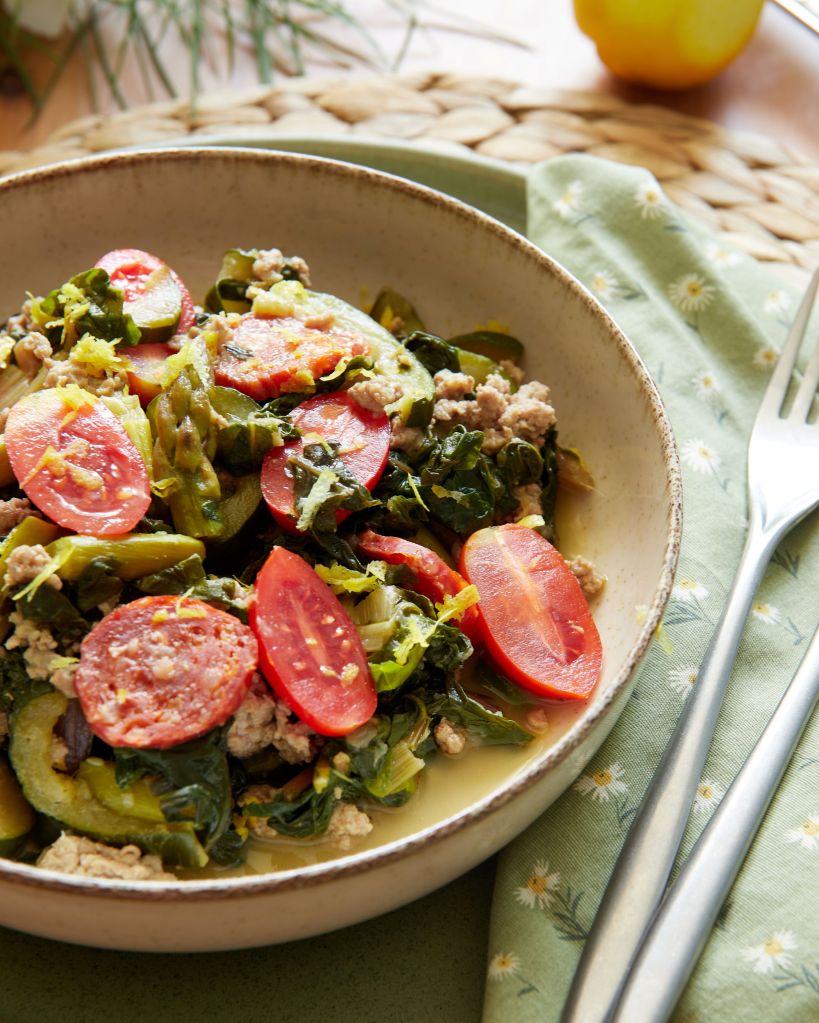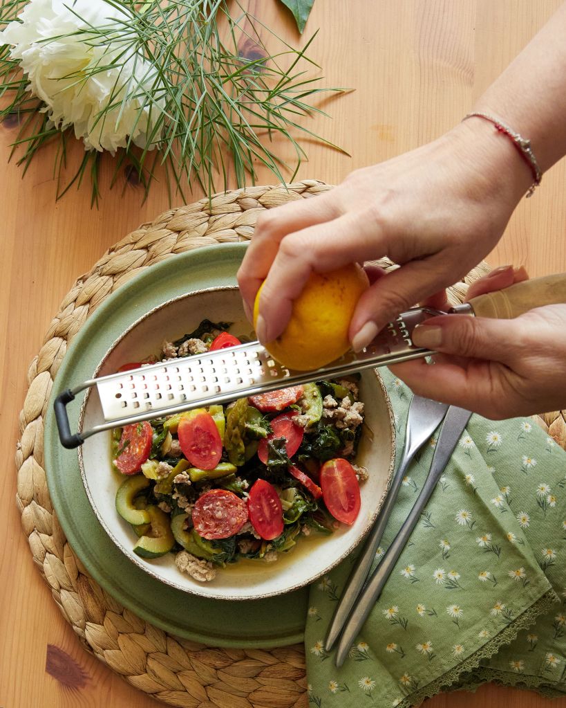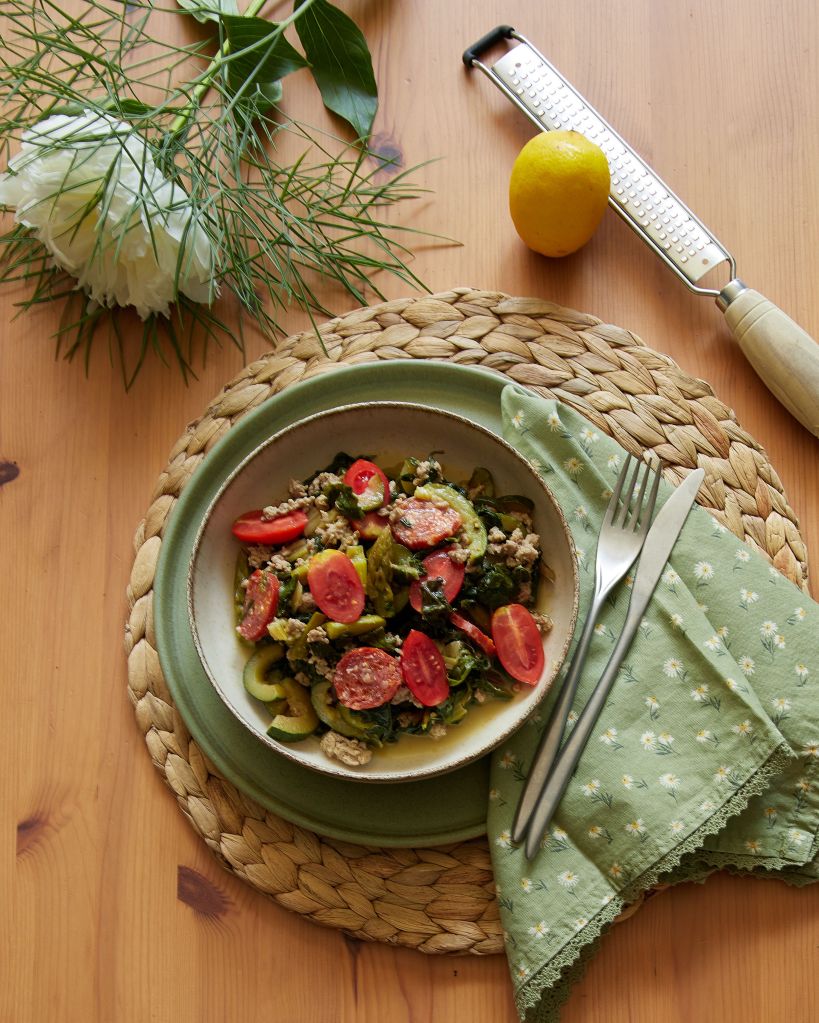 Добавих им тиквички, манголд, левурда и малко чоризо и приготвих като въз-суха яхния, на практика без сос. За вкус добавих също хранителна мая, сухи „италиански“ подправки и настъргана лимонова кора. За цвят и свежест, съвсем накрая – срязани наполовина чери домати.