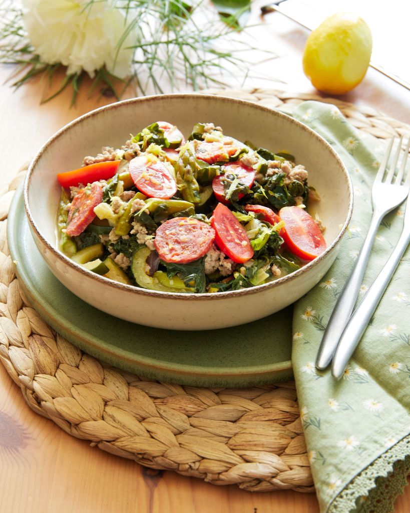 Добавете манголда (на части, ако трябва) и изчакайте да намали обема си – около 2 – 3 минути. Добавете левурдата, връхчетата на аспержите, чоризото и подправките. Разбъркайте и гответе 5 – 10 минути. Последно добавете доматите, разбъркайте и свалете от котлона.