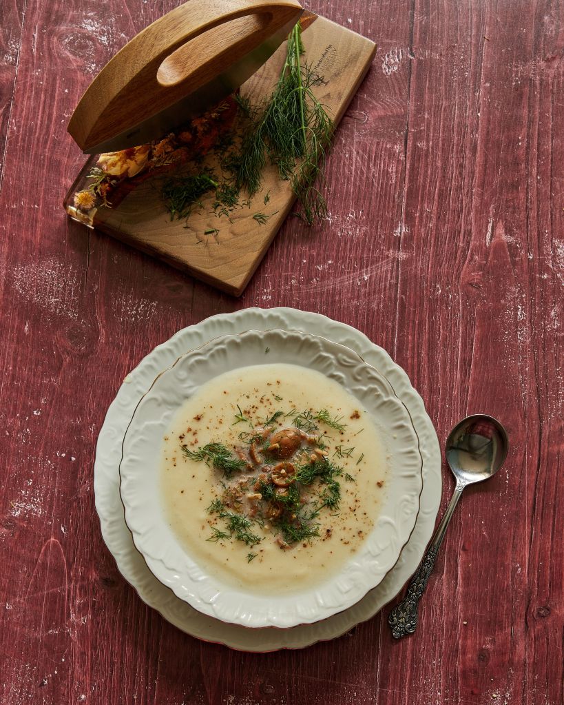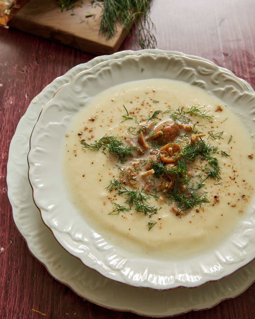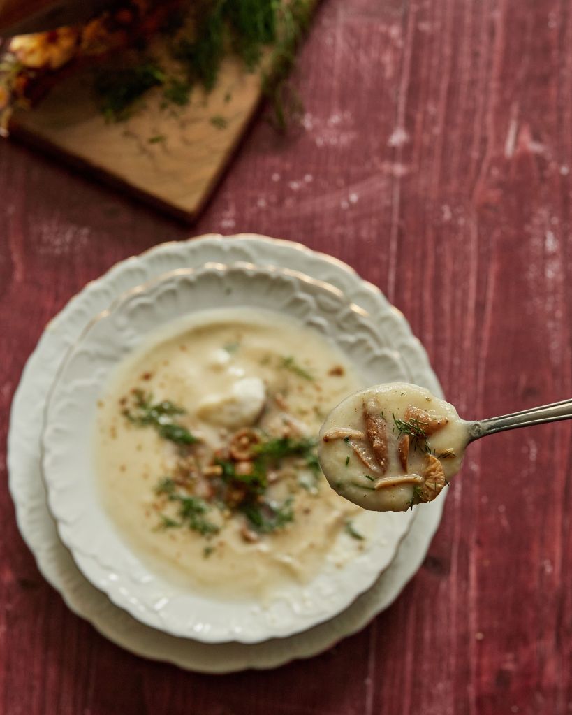 И двата продукта влязоха в тази много вкусна крем супа. Добавих шалот, сметана, малко масълце, черен пипер, сол с естрагон на Спайзинг и пресен копър. Гъбите сварих отделно и запазих цели, а всичко останало блендирах до мека кадифена консистенция.