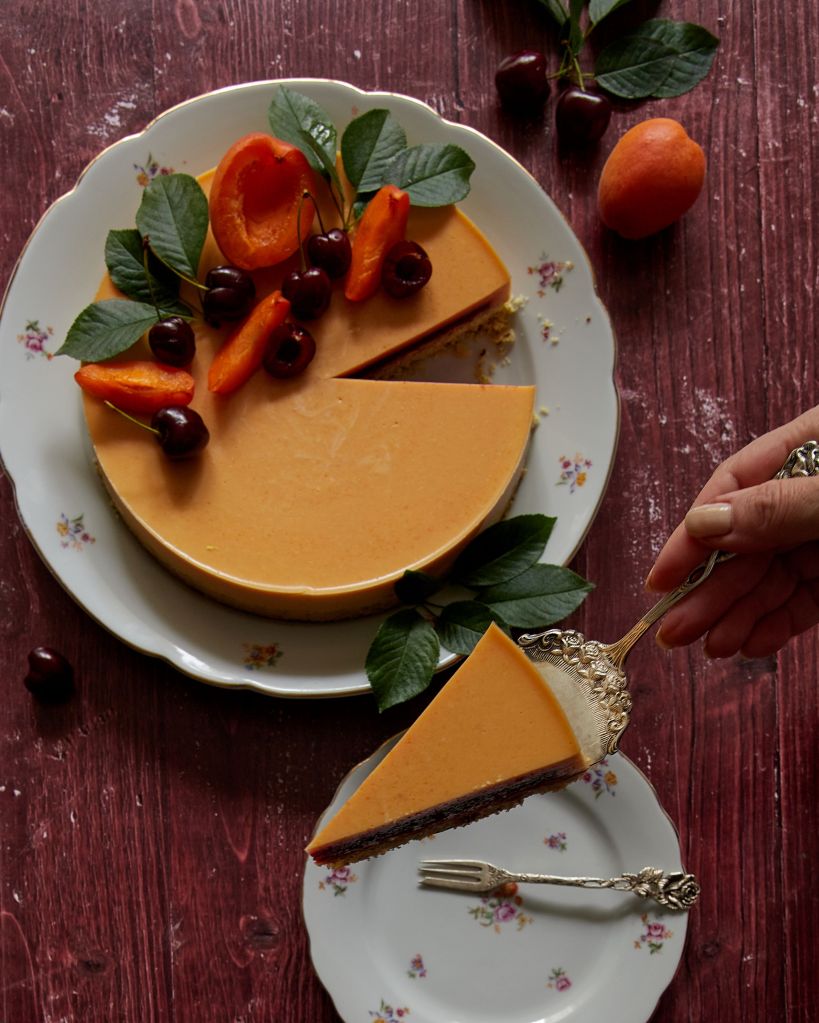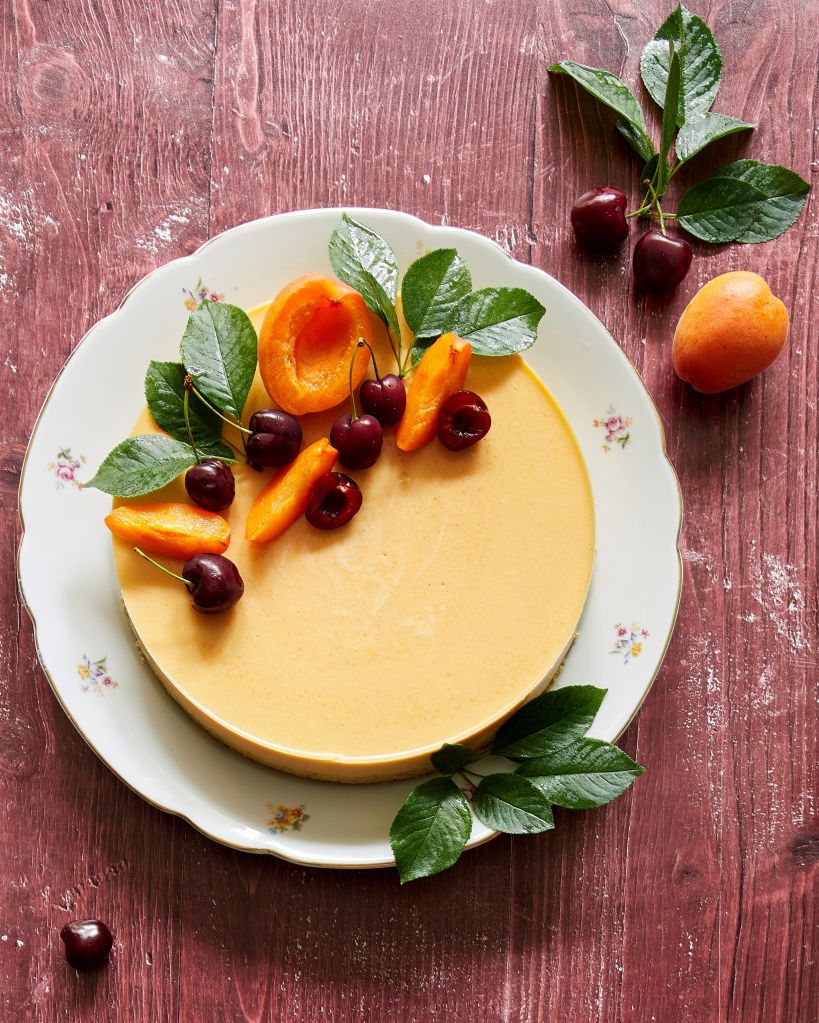 Свалете от котлона и добавете останалото кайсиево пюре. Разбъркайте добре и поддържайте течно, като разбърквате от време на време, докато черешовият слой стегне. Когато това стане, извадете тортата от хладилника и свалете внимателно ринга. Нагласете го отново около тортата и изсипете кайсиевата панакота в така оформената вътрешност. Приберете за последен път в хладилника за около час. Гарнирайте според желанието си и сервирайте охладена. Понеже кокосовата панакота е много устойчива, може да я държите и на стайна температура в затворен съд, стига стайната температура да не надхвърля 23 – 24 градуса.