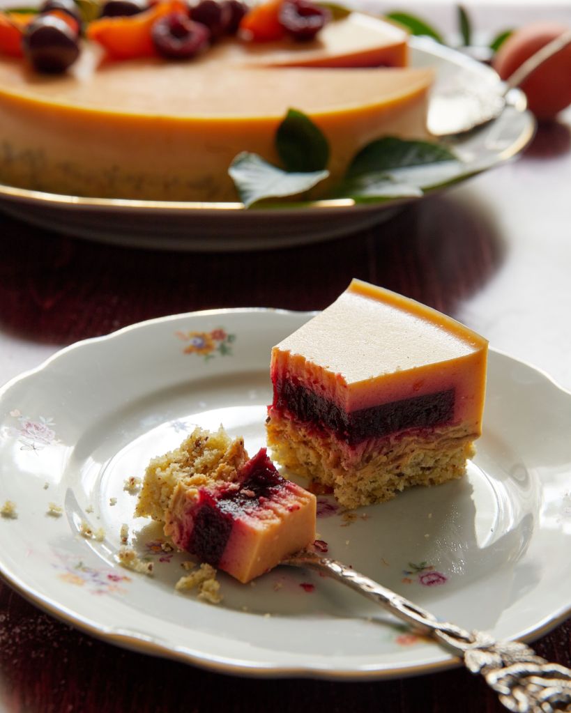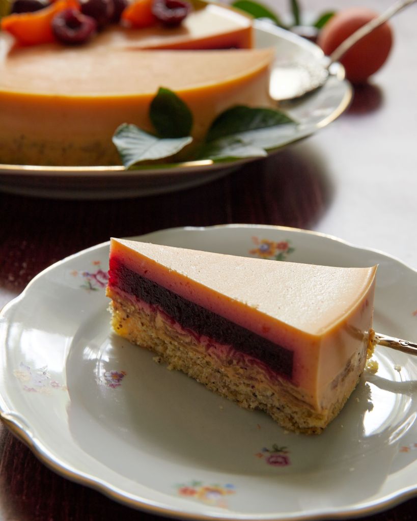 И така, когато реших да направя нещо с кайсии и череши, ми дойде идеята да пробвам да добавя точно това, като фалшив фюлетин в един от слоевете. За съжаление не остана хрупкав, понеже в кокосовото мляко (дори в пълномасленото) има поне 40% вода, за което трябваше да се сетя, разбира се. Но и така тази торта-панакота е много свежа и вкусна (пък и красива в разрез) и затова реших, че заслужава да бъде споделена. А за мен остава да експериментирам още с идеята за фюлетин от ръчно точени кори.
