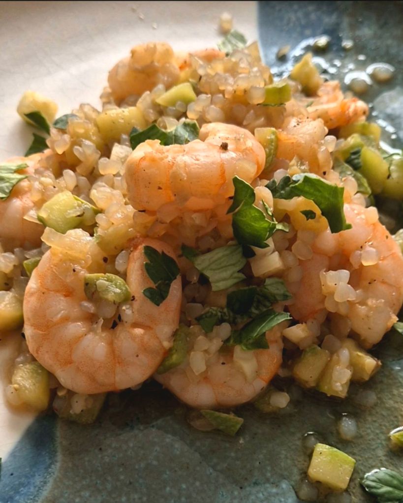 Загрейте зехтина на средна степен на котлона и добавете лука и чесъна. Гответе 2 – 3 минути и добавете тиквичките. Подправете със сол и черен пипер и гответе 5 – 10 минути. Добавете конджак ориза и гответе 2 – 3 минути. Добавете скаридите и гответе още 2 – 3 минути, до готовност. Добавете соевия сос, разбъркайте и свалете от котлона. Сервирайте със зеленолистно по избор.