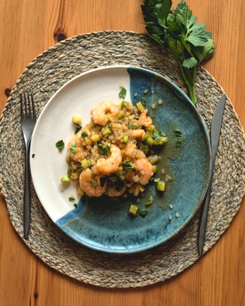 Поредното ястие в категория обяд/вечеря за под 30 минути. За него използвах „ориз чудо“ от конджак. Ако за пръв път чувате за него, конджак е кореноплодно с много високо съдържание на фибри (глюкоманан), които се продават и като добавка и предизвикват чувство на ситост. Има „ориз“ и „паста“ от конджак, но за мен пастата е прекалено далече като вкус от истинската и не е добър заместител.