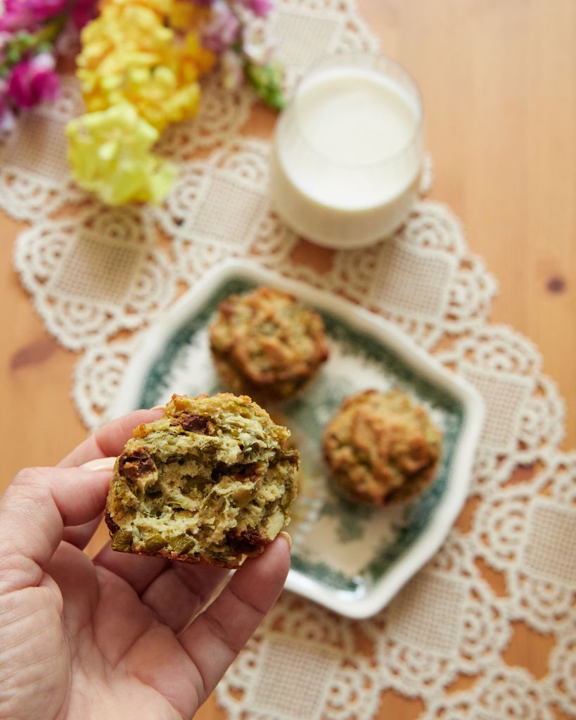 Направих една супа с тиквички и киселец, която обаче не стана достатъчно добра за споделяне и тези солени мъфини. За тях направих тесто с бадемово и нахутено брашно, със зехтин и извара. Сложих протеин от тиквено семе и настъргано пекорино, което може да се замени с пармезан или кашкавал. Освен киселеца добавих сушени домати и малко от италианската смес от подправки на Спайзинг.